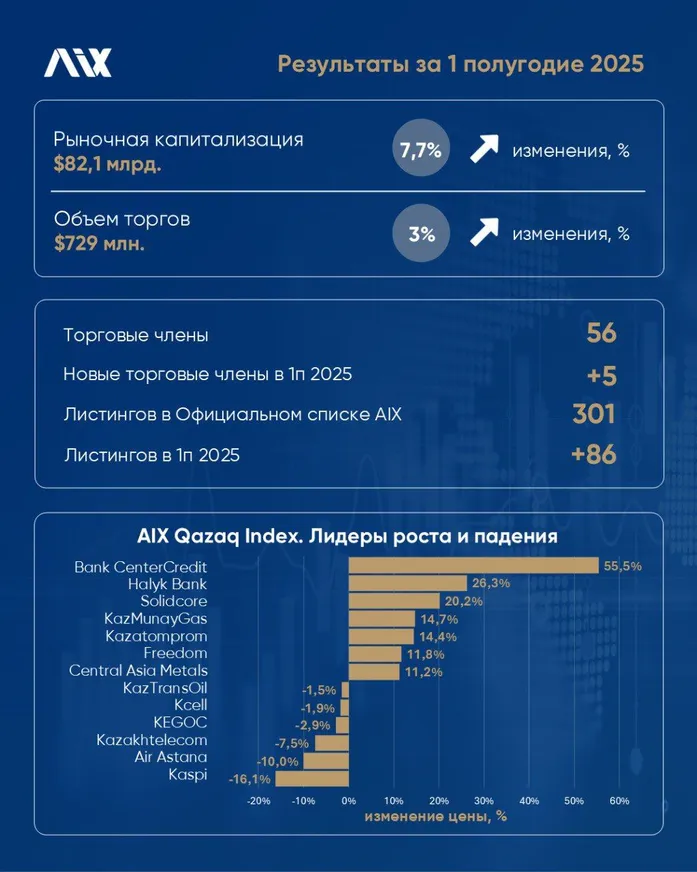 За январь–июнь 2025 года объем торгов на бирже Astana international Exchange (AIX) вырос на 3,2% к прошлому году и достиг 729 млн долларов, сообщает корреспондент центра деловой информации Kapital.kz со ссылкой на данные биржи.