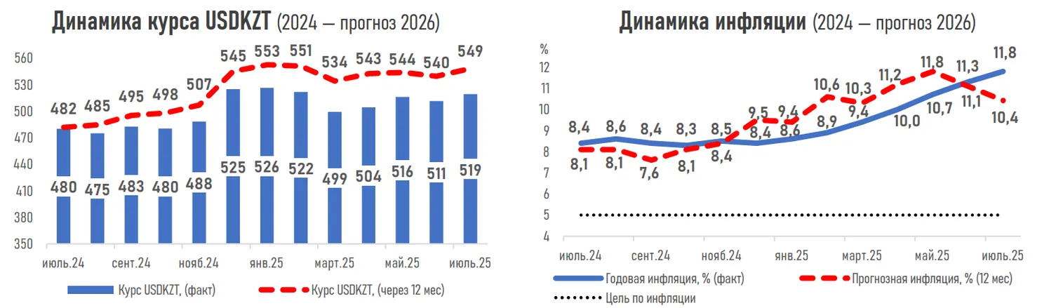 К началу августа 2025 года курс доллара может составить 523,4 тенге (текущий – 519,2), а через год — вырасти до 548,5 тенге (в прошлом прогнозе – 516,3 и 539,7 тенге соответственно). На ожидания может влиять прогнозируемое ухудшение текущего счёта и общее сокращение профицита торгового баланса под влиянием нестабильных цен на экспортные товары.