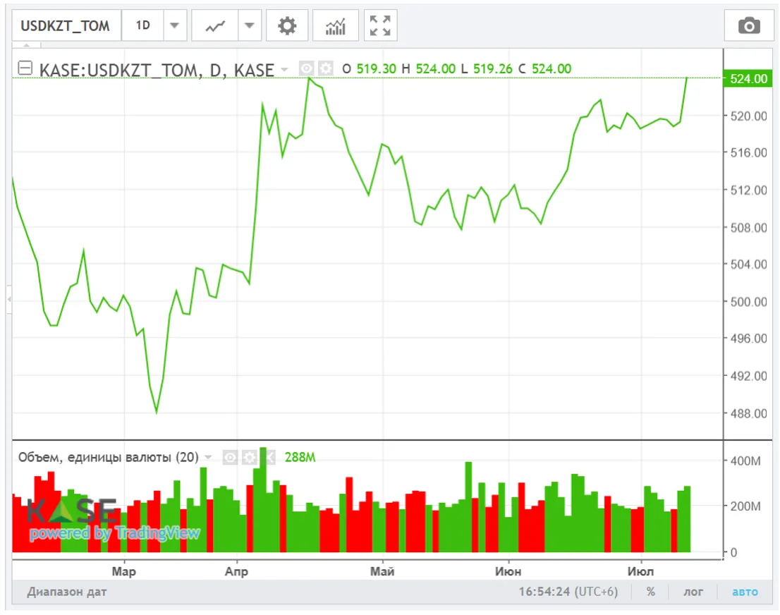 Нацвалюта в пятницу возобновила падение на фоне сохраняющегося повышенного спроса на инвалюту внутри страны, несмотря на сохранение высокой базовой ставки. Так, по итогам валютных торгов 11 июля 2025 года курс USD/KZT вырос до отметки 521,31 тенге за доллар (+2,84 тенге). В то же время объём торгов составил 287,6 млн долларов (+17,8 млн). Отметим, что спрос на инвалюту внутри страны стимулируется в том числе реализацией крупных инфраструктурных проектов, требующих приобретения импортного оборудования, техники и лицензий.