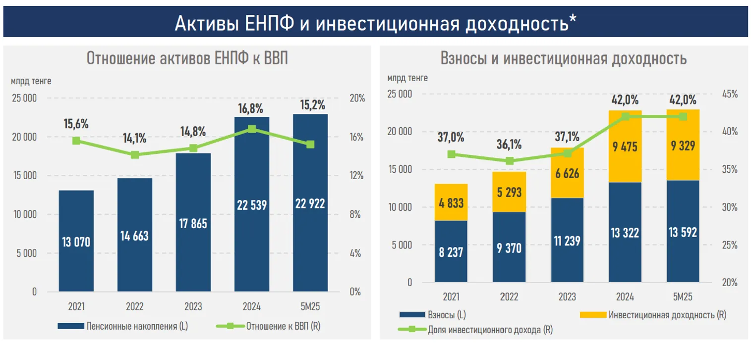 На 1 июня общая сумма пенсионных накоплений составила 22,9 трлн тенге, увеличившись с начала года на 383 млрд тенге или 1,7%. Темпы роста сложились заметно ниже, чем год назад (+7,2% за аналогичный период 2024 г.), что связано не столько с динамикой взносов, сколько с отрицательным инвестиционным доходом на фоне нестабильности на финансовых рынках и колебаний валютного курса.