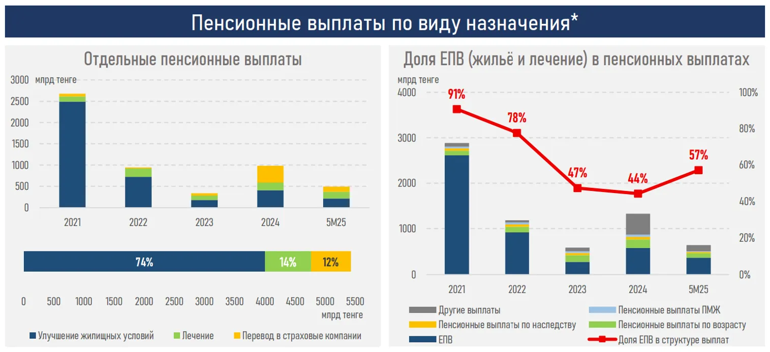 За 5 месяцев текущего года на ЕПВ пришлось 369 млрд тенге (рост в сравнении с аналогичным периодом 2024 г. на 156% или 144 млрд тенге), что составляет 57% всех выплат в текущем году.