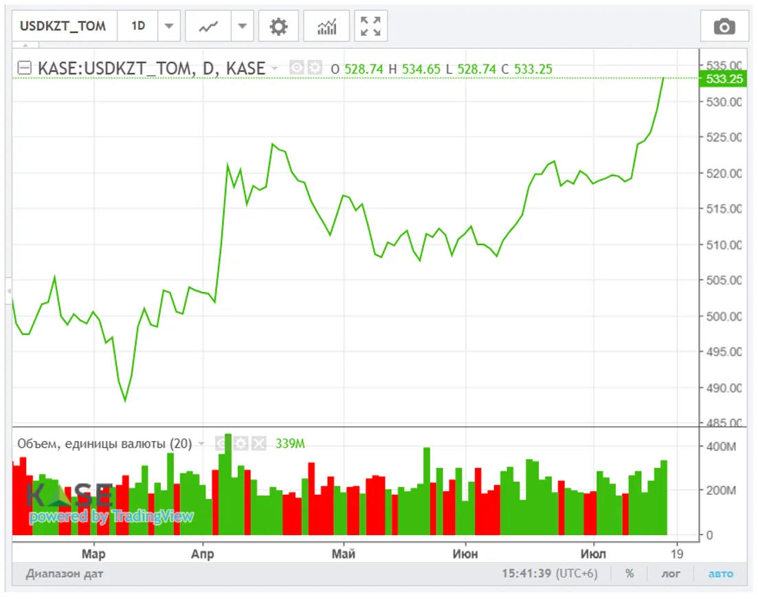 Курс доллара ускорил рост в четверг в отсутствие каких-либо фундаментальных причин, приближаясь к новому бюджетному ориентиру на следующий год (540 тенге за доллар). По итогам торгов четверга курс по паре USD/KZT составил 533,07 тенге за доллар, показав рост на 6,38 тенге. При этом объём торгов продолжил расти – до 339,2 млн долларов (+38,3 млн). Очевидно, что в данный момент отчасти ажиотажный спрос на инвалюту значительно превышает её предложение.