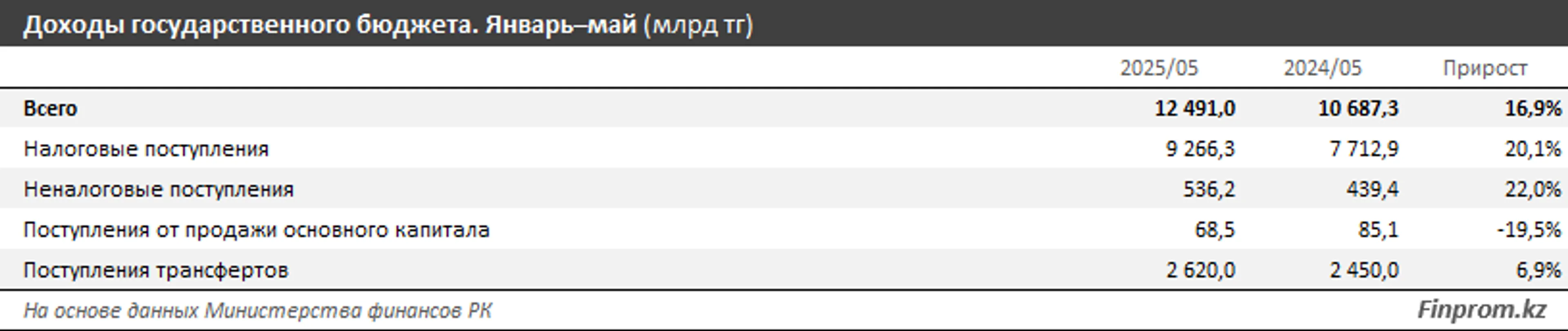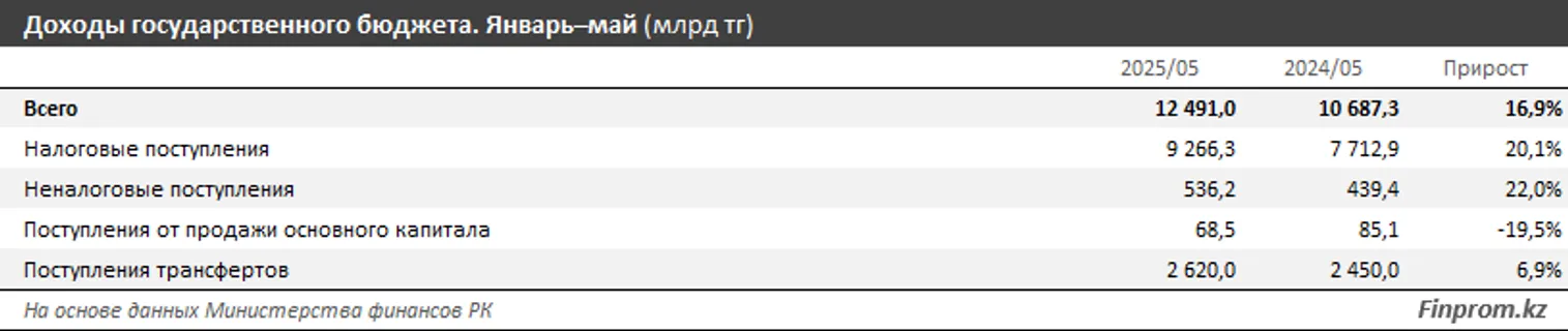 Основную часть — 74,2% — доходов традиционно составили налоговые поступления в бюджет: 9,3 трлн тенге — на 20,1% больше, чем за январь–май прошлого года.