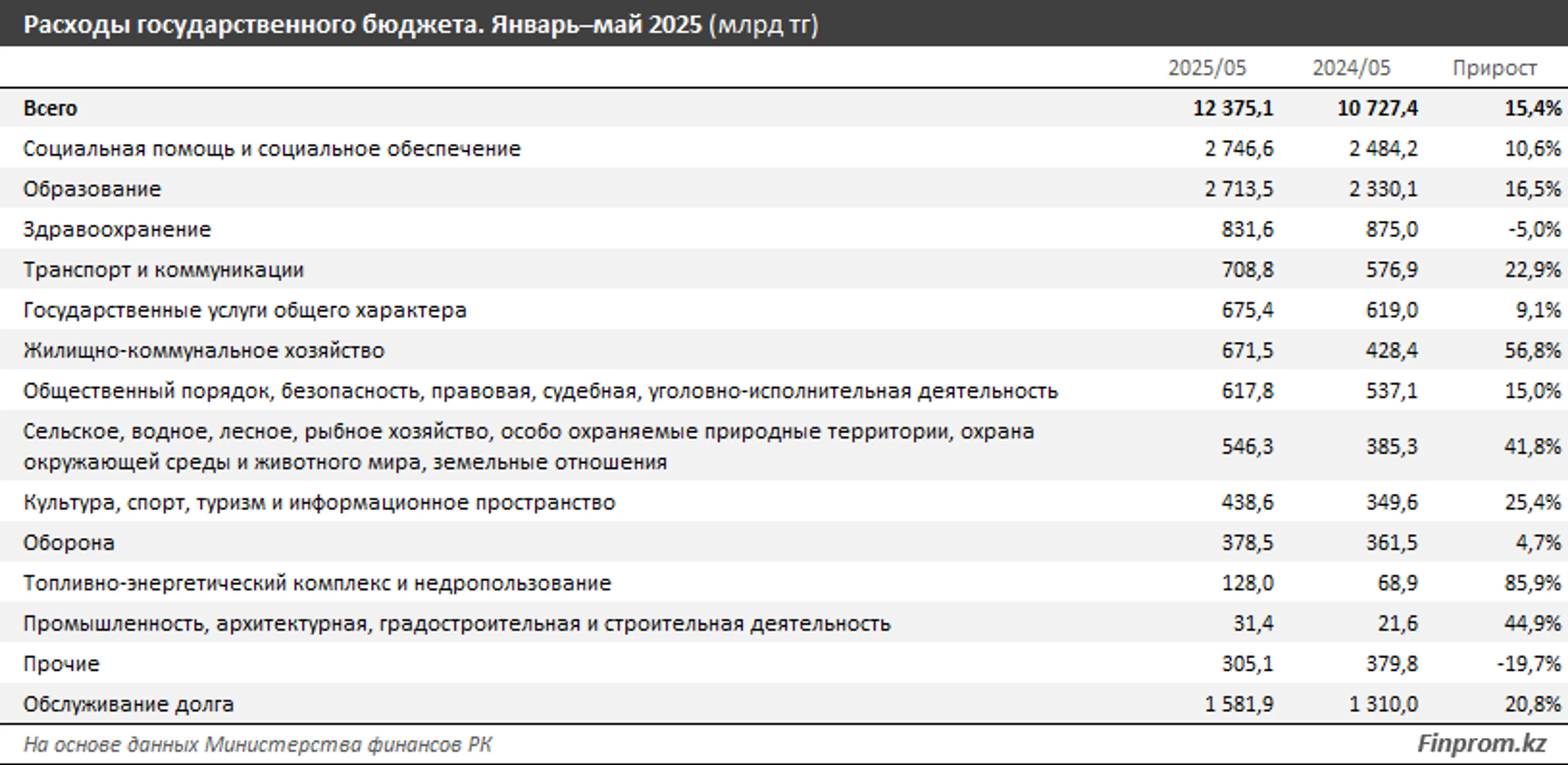 По итогам января–мая 2025-го расходы государственного бюджета РК составили 12,4 трлн тенге — на 15,4% больше, чем годом ранее.