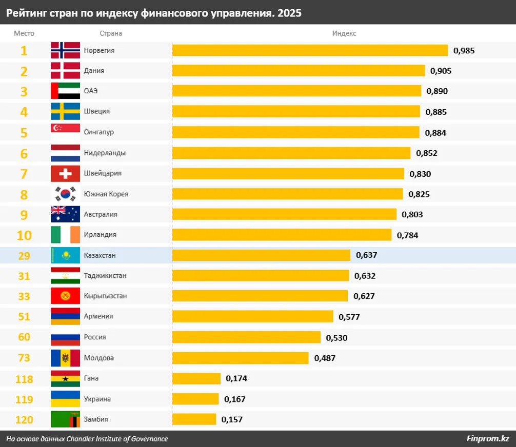 Казахстан опустился на две строчки в мировом рейтинге по индексу финансового управления. Страна заняла 29-е место из 120, набрав 0,637 балла, пишет Finprom.kz.