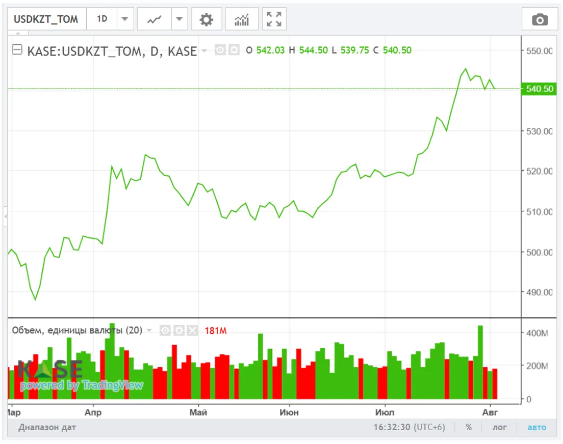 На текущий момент (10:47 ALA) курс по паре USD/KZT торгуется на уровне 538,40 тенге за доллар.
