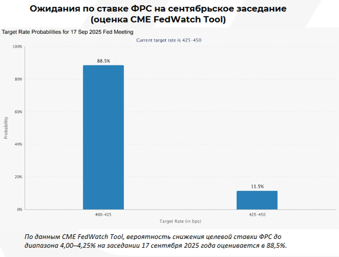 Картина по экономике смешанная: индекс ISM в сфере услуг снизился до 50,1 — минимального уровня с 2022 года, сигнализируя о замедлении, тогда как индекс S&P Services PMI вырос до 55,7, отражая локальный рост в IT и финансах. Производительность труда в нефинансовом секторе выросла на 2,4% (выше прогноза 2,2%), а почасовая оплата на 4,2% г/г, что дало положительные реальные доходы на фоне инфляции ~2,7%. Вероятность снижения ставки ФРС в сентябре достигла 88,5%, хотя члены регулятора предупреждают о необходимости балансировать между поддержкой занятости и контролем инфляции.