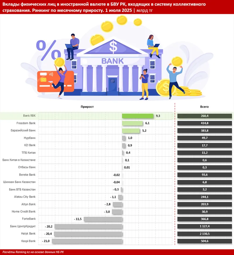 В минусе оказались сразу 10 банков, которые входят в систему страхования вкладов населения, в плюсе — 8 БВУ, причем в заметном — всего три фининститута. Посмотрим, в каких банках казахстанцы активнее всего размещали депозиты в долларах, евро и прочих свободно конвертируемых валютах.