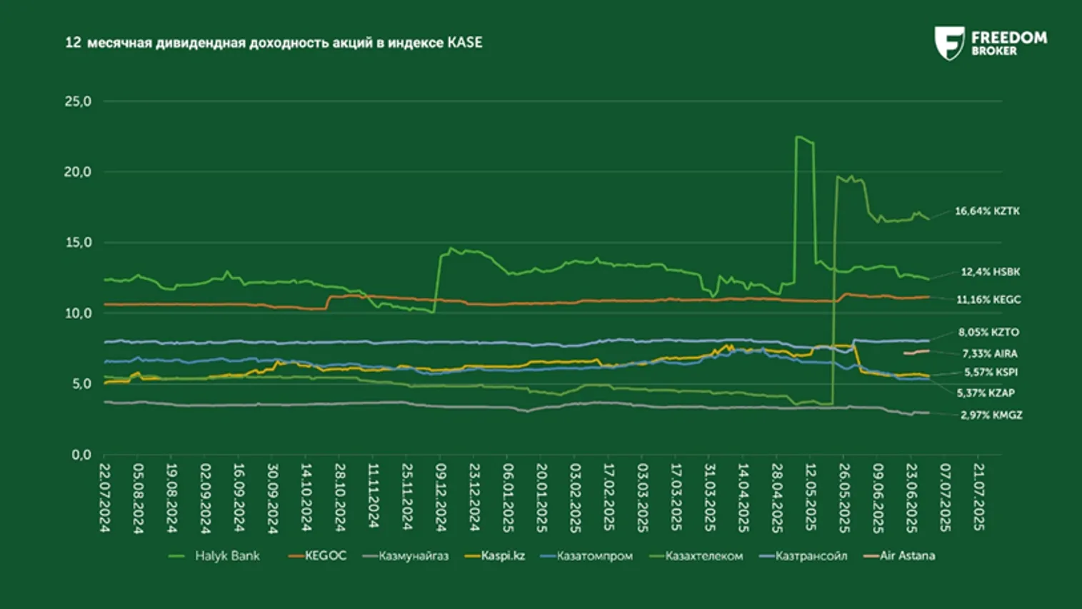 На графике выше представлена годовая динамика 12-месячной дивидендной доходности акций в индексе KASE с июля 2024 года до 30 июня 2025-го. Наибольшим показателем в данном случае владеют акции Казахтелекома, с доходностью в 16,64%. Однако тут стоит сделать важную оговорку: Казахтелеком на годовом общем собрании акционеров утвердил повышенные специальные дивиденды в размере 26 664,88 тенге, что является распределением средств после продажи двух сотовых операторов Altel и Tele2. Это больше чем в 12 раз превышает выплаты предыдущего года. В связи с единоразовым характером таких дивидендов логичнее будет взять за основу доходность до данной выплаты, которая составляла 3,6%.