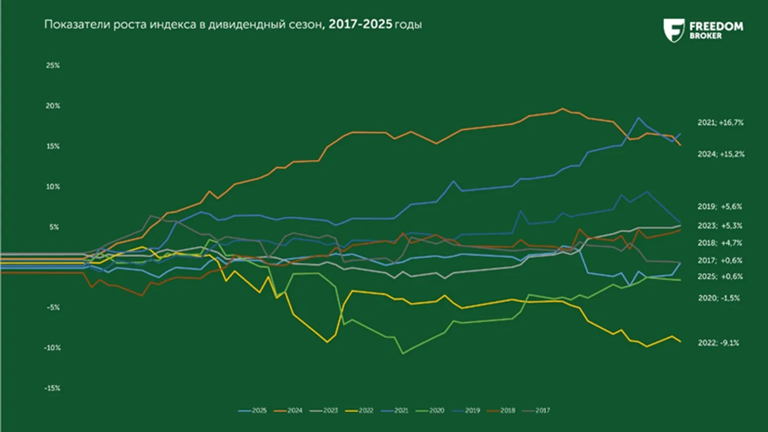 Первые шаги будущей динамики закладываются еще в феврале, когда казахстанские компании начинают отчитываться за четвертый квартал и весь прошлый год. На данном этапе у инвесторов формируется понимание, какой размер дивидендов может выплатить эмитент. Eсли год прошел удачно, то в периоде с февраля до середины апреля чаще всего отмечается неплохой рост индекса KASE, что обусловлено покупками акций под планируемые дивиденды. Этот период мы называем дивидендным сезоном. Исторические данные показывают, что с 2017 по 2025 год в дивидендный сезон индекс KASE вырастает в среднем на 4,2%. Конечно, бывают и ситуации, когда котировки снижаются, однако причины тут могут быть те же – риски пониженных и либо полностью отмененных дивидендов выступают в качестве негативного фактора для инвесторов. Примером такого периода является 2020 год, когда эпидемия коронавируса стала причиной отмены/переноса выплат у большинства центральных дивидендных компаний на рынке. Схожая ситуация была и в феврале 2022 года, когда рынок охватила неопределенность из-за начала войны между Россией и Украиной. Оба кейса скорее являются нестандартными для рынка ситуациями, также именуемыми «черными лебедями». Если исключить эти два года из ретроспективной статистики, то с 2017 по 2025 год средний прирост индекса KASE в дивидендный сезон составляет 7%.