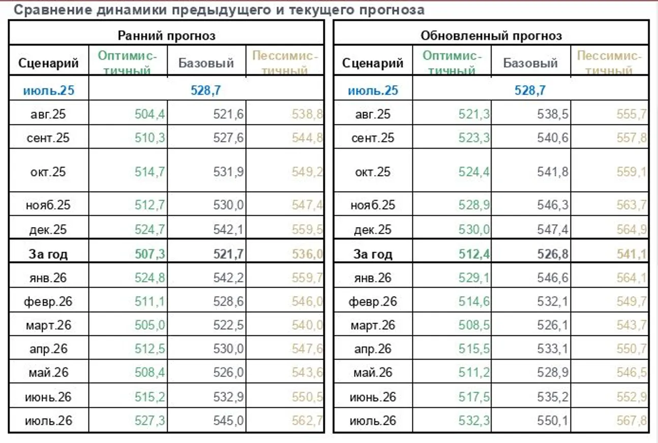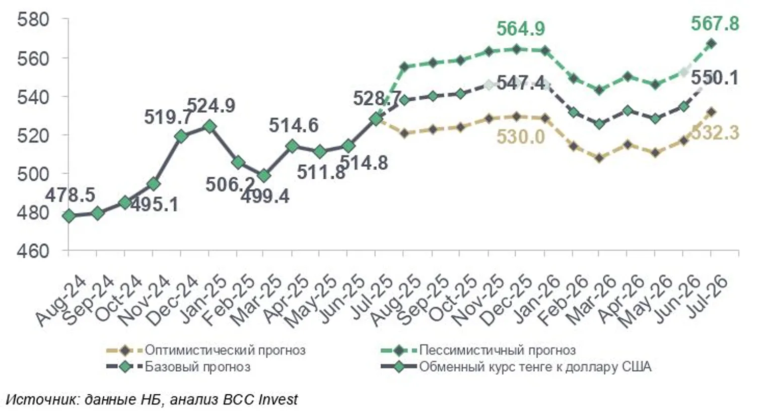 «Во второй половине июля 2025 года на динамику обменного курса USD/KZT в большей степени повлияли негативные факторы, вследствие чего обменный курс в моменте ослаб до уровня 550 тенге за доллар. При этом в среднемесячном выражении динамика обменного курса сохранилась в рамках между базовым (отклонение 9,7 тенге или 1,9%) и пессимистичным (отклонение 7,4 тенге или 1,4%) сценариями прогноза обменного курса. В результате выраженных негативных факторов команда аналитиков BCC Invest обновляет прогноз по динамике среднемесячного обменного курса USD/KZT на следующие 12 месяцев», - пояснили в компании.