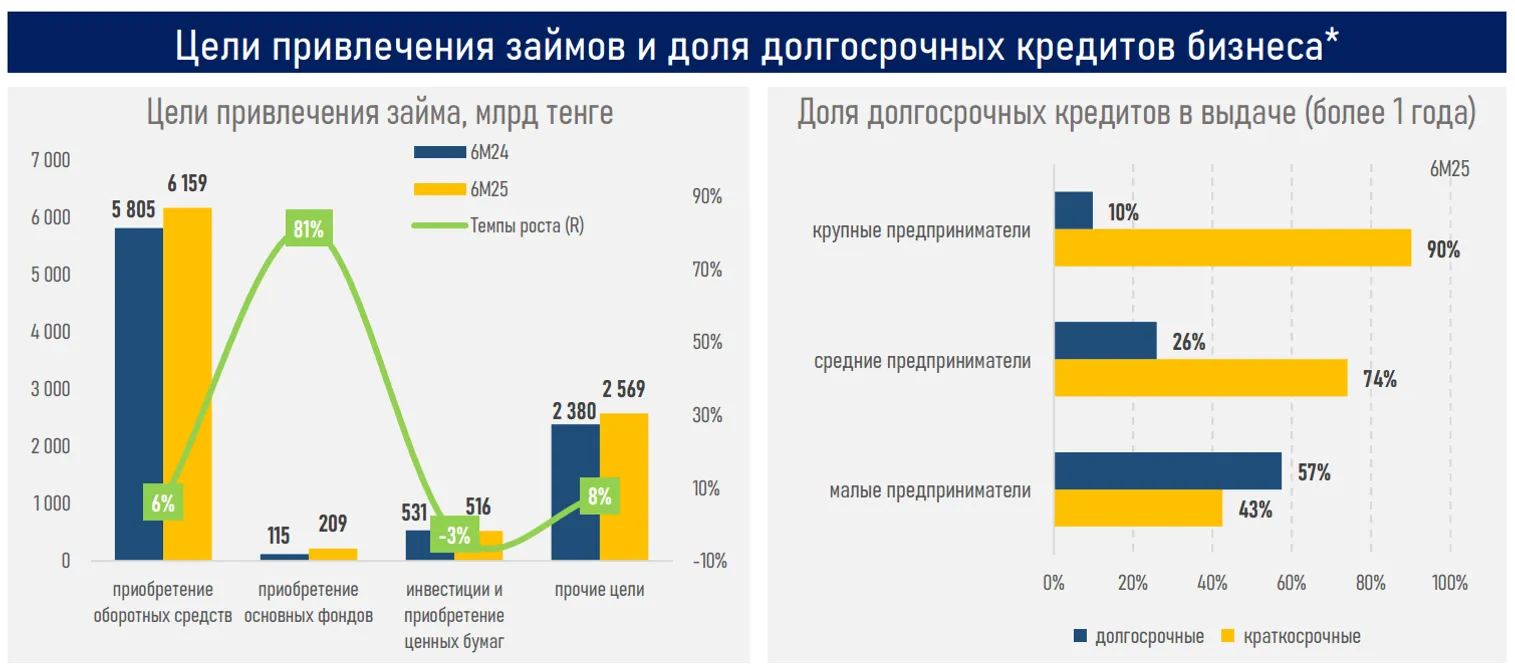Кредитная активность в корпоративном секторе в первом полугодии 2025 года формировалась на пересечении двух факторов: устойчивого спроса со стороны крупного бизнеса и сохраняющихся ограничений деловой среды. С одной стороны, объем выданных новых заёмных средств бизнесу достиг 9,4 трлн тенге (+12% г/г), что отражает продолжающееся расширение финансового посредничества. С другой — опросы предприятий показывают, что ключевыми барьерами для ведения бизнеса остаются налоговое бремя, конкуренция и общее состояние экономики, тогда как доступ к финансированию воспринимается как второстепенный фактор (лишь 10 по счёту).