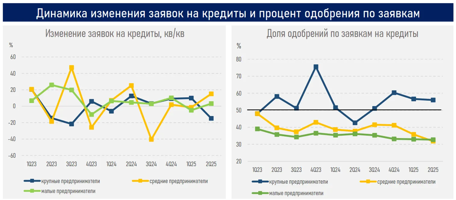 Разрыв в динамике по субъектам подтверждает эту картину: крупные компании обеспечили основной прирост выдачи (+18%), опираясь на инвестпроекты и более высокий уровень одобрения заявок, тогда как малые и средние предприятия столкнулись с большей чувствительностью к росту ставок и ограниченной финансовой устойчивостью. Для МСБ компенсирующую роль сыграли госпрограммы, что отражает важность институциональной поддержки в условиях высоких ставок в системе.
