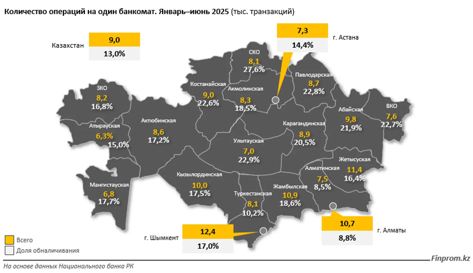 Наибольшее количество операций по снятию наличных в расчёте на один банкомат за январь–июнь текущего года было зафиксировано в Шымкенте: 12,4 тыс. транзакций. Следом идут Жамбылская область (10,9 тыс. транзакций), Алматы (10,7 тыс. транзакций) и Кызылординская область (10 тыс. транзакций).