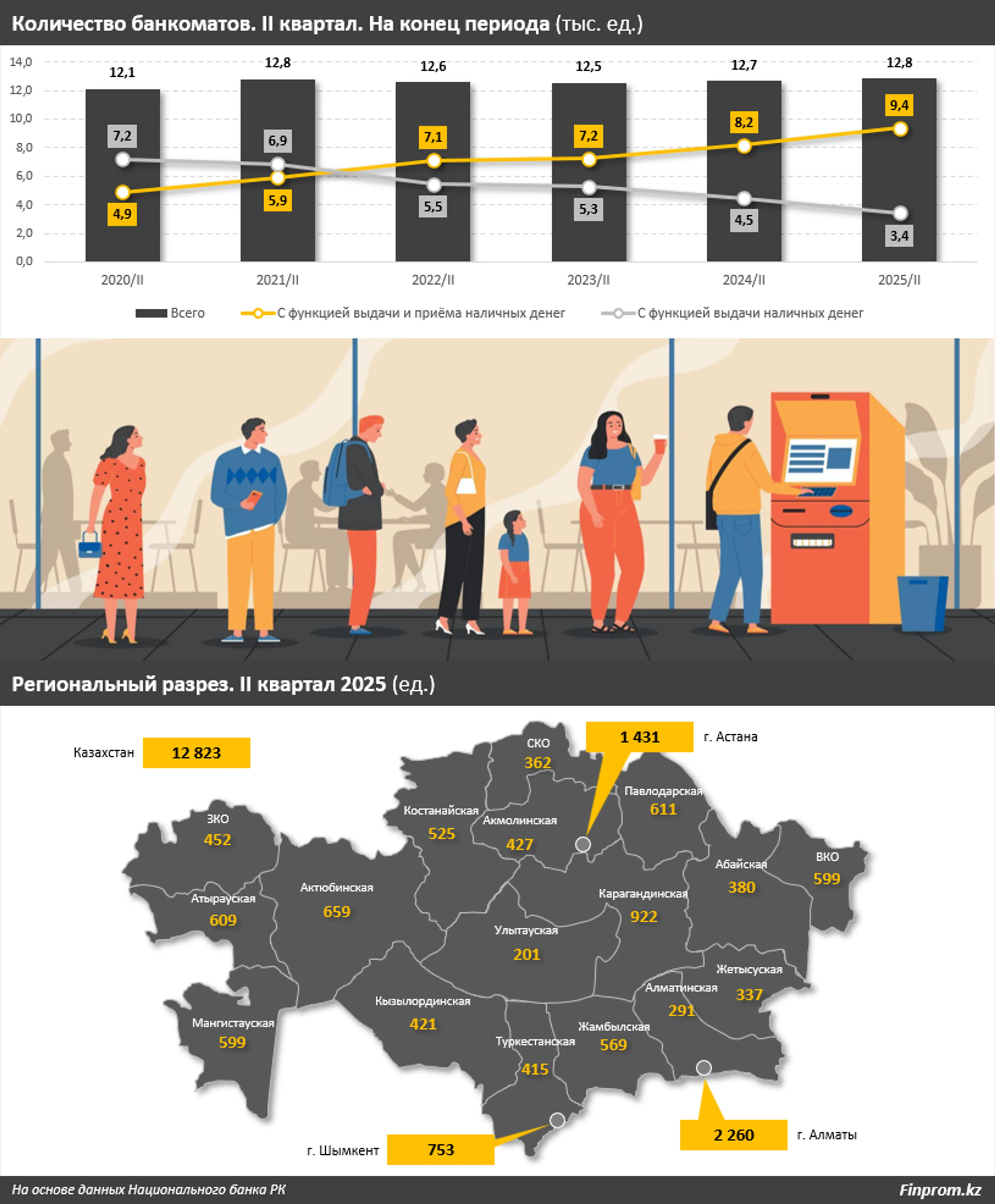 Сразу более трети всех банкоматов суммарно насчитывалось лишь в трёх регионах РК — Алматы (2,3 тыс. ед.), Астане (1,4 тыс. ед.) и Карагандинской области (922 ед.). Значительное количество банкоматов также было зафиксировано в Шымкенте: 753 ед. В остальных регионах их число варьировалось от 201 ед. в Улытауской до 659 ед. в Актюбинской области.