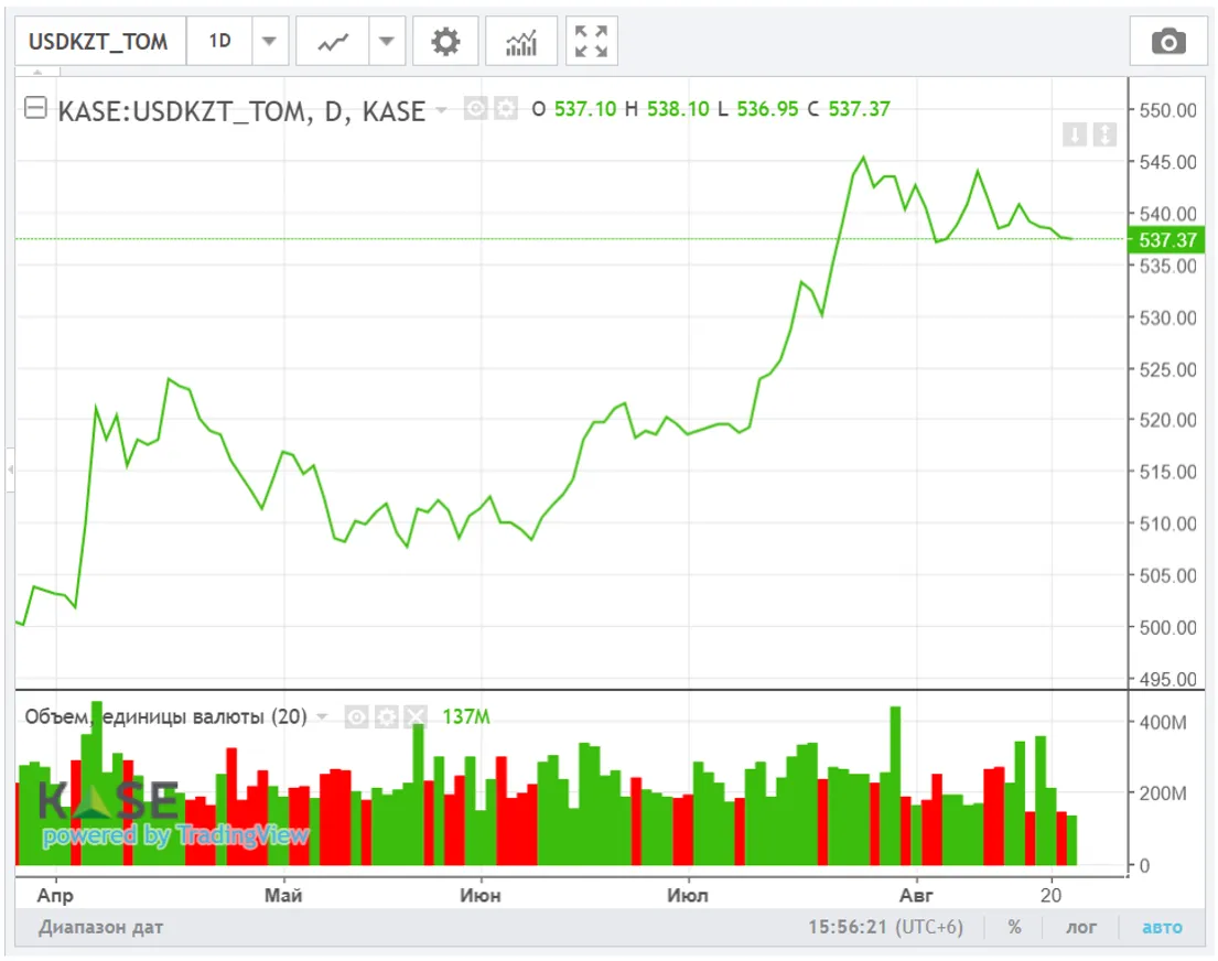 Нацвалюта продолжает находиться под влиянием внутренних факторов при благоприятных внешних (укрепление нефти и снижение индекса доллара). По итогам торгов на KASE в пятницу средневзвешенный курс USD/KZT снизился до 537,36 тенге за доллар (-0,37 тенге). При этом объём торгов составил 137,0 млн долларов, показав снижение на 12 млн долларов по сравнению с торгами четверга. Поддержку нацвалюте, помимо операций по продаже инвалюты Национальным банком и субъектами КГС, может оказывать конвертация валютной выручки экспортёрами в связи с пиком квартального налогового периода в стране (25.08).