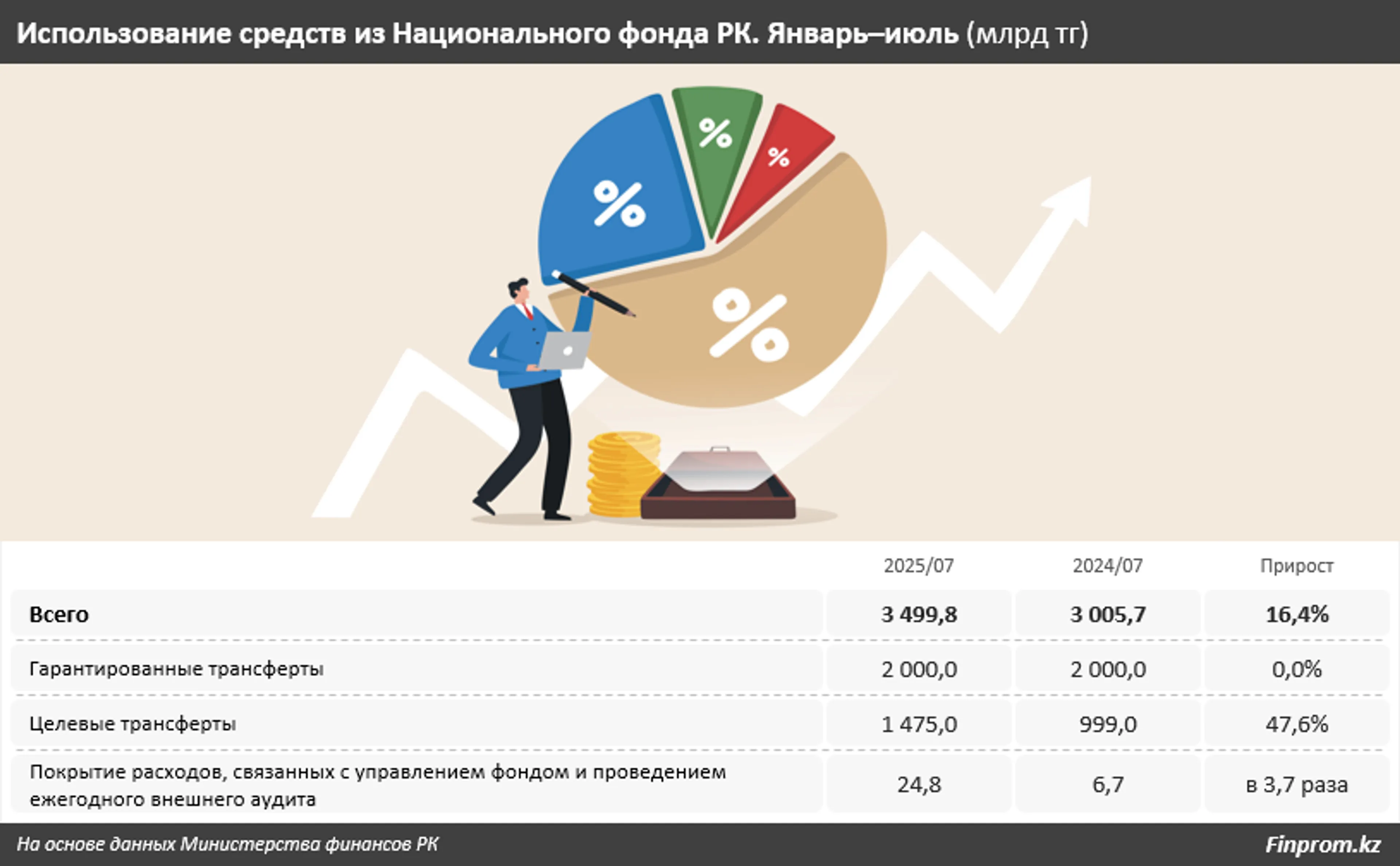 Теперь обратимся к данным по расходам. За семь месяцев текущего года из Нацфонда было потрачено 3,5 трлн тенге — на 16,4% больше, чем за аналогичный период 2024-го. Большая часть этих средств — гарантированные трансферты — остались неизменными в размере 2 трлн тенге. Нельзя сказать того же о целевых трансфертах, объём изъятия которых увеличился на 47,6%, до 1,5 трлн тенге. В 3,7 раза выросли расходы фонда на его управление и проведение ежегодного внешнего аудита. За эту работу было выплачено 24,8 млрд тенге.