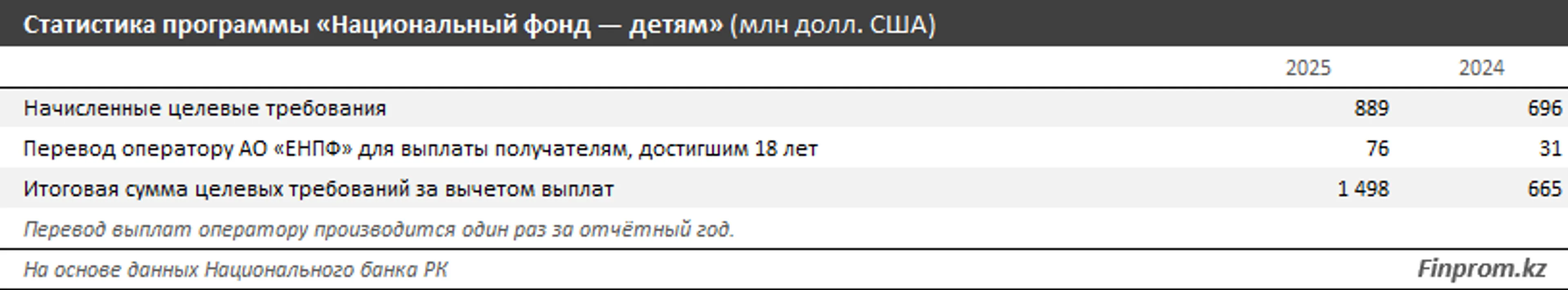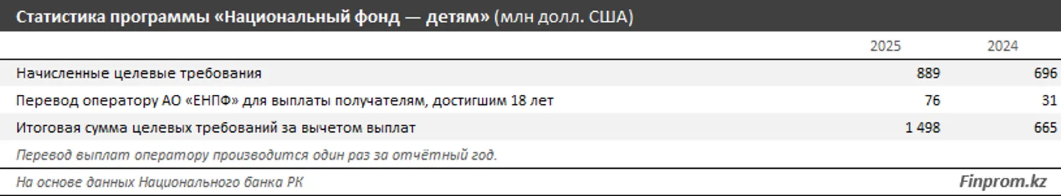 В текущем году объём начисленных детям средств составил уже 889 млн долларов. Тем, кто отпразднует восемнадцатилетие в 2025-м, будет выплачено в общей сложности 76 млн долларов. Общий объём накопленных «детских» средств в Нацфонде к концу года должен составить около 1,5 млрд долларов.