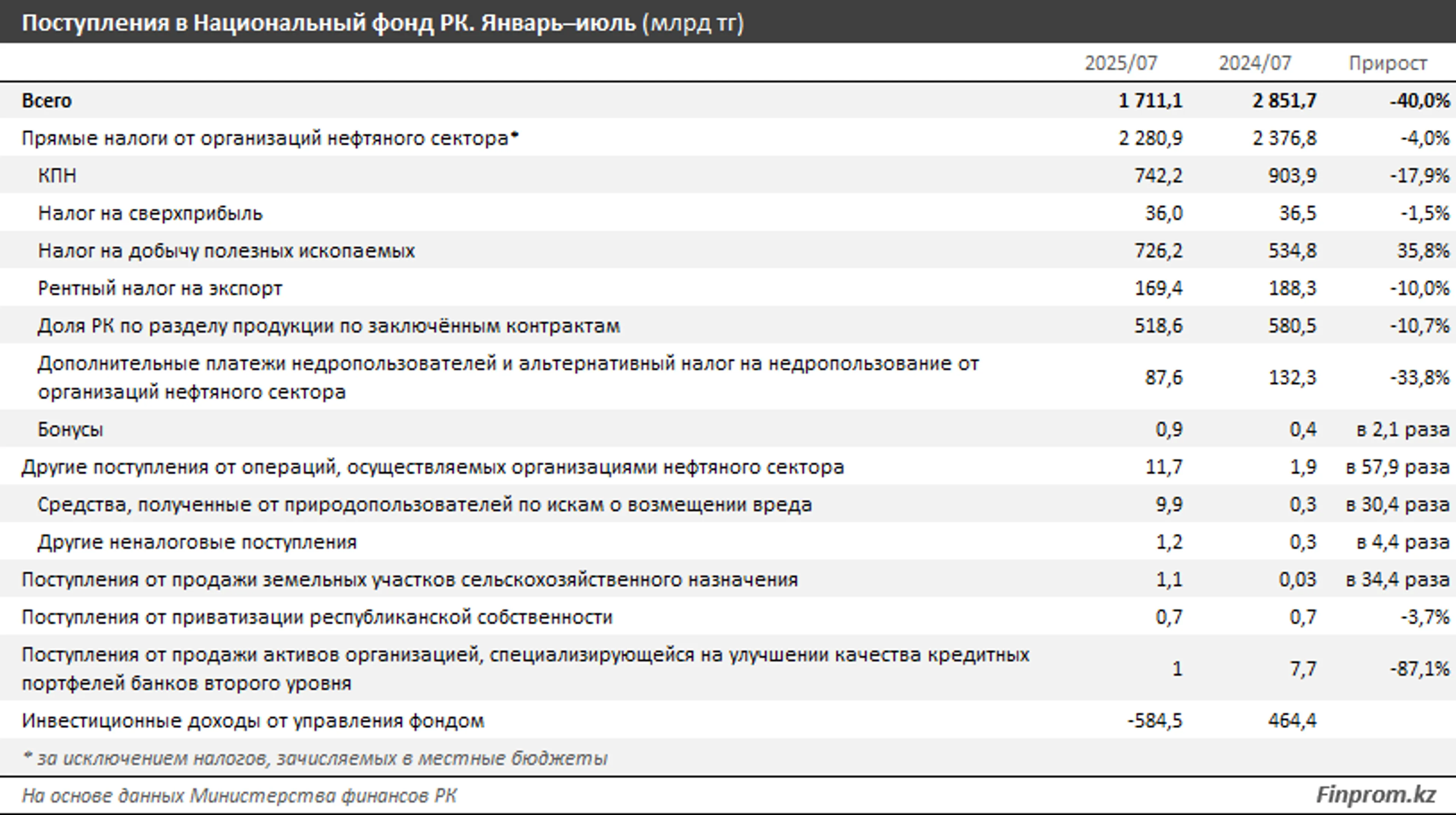 Главной причиной сложившейся большой разницы между расходами и поступлениями в текущем году стало резкое сокращение доходов фонда. Согласно отчётам Министерства финансов РК, за январь–июль поступления в фонд уменьшились на 40%, с 2,9 трлн до 1,7 трлн тенге. Сократились объёмы поступлений практически по всем видам налогов от нефтяного сектора, кроме обязательных платежей за добычу полезных ископаемых. Самый капиталоёмкий для фонда налог — корпоративный — уменьшился в январе–июле текущего года на 17,9%. Казахстан также получил значительно меньше средств в качестве доли по заключённым нефтяным контрактам: 518,6 млрд тенге, против 580,5 млрд тенге в январе–июле 2024-го.