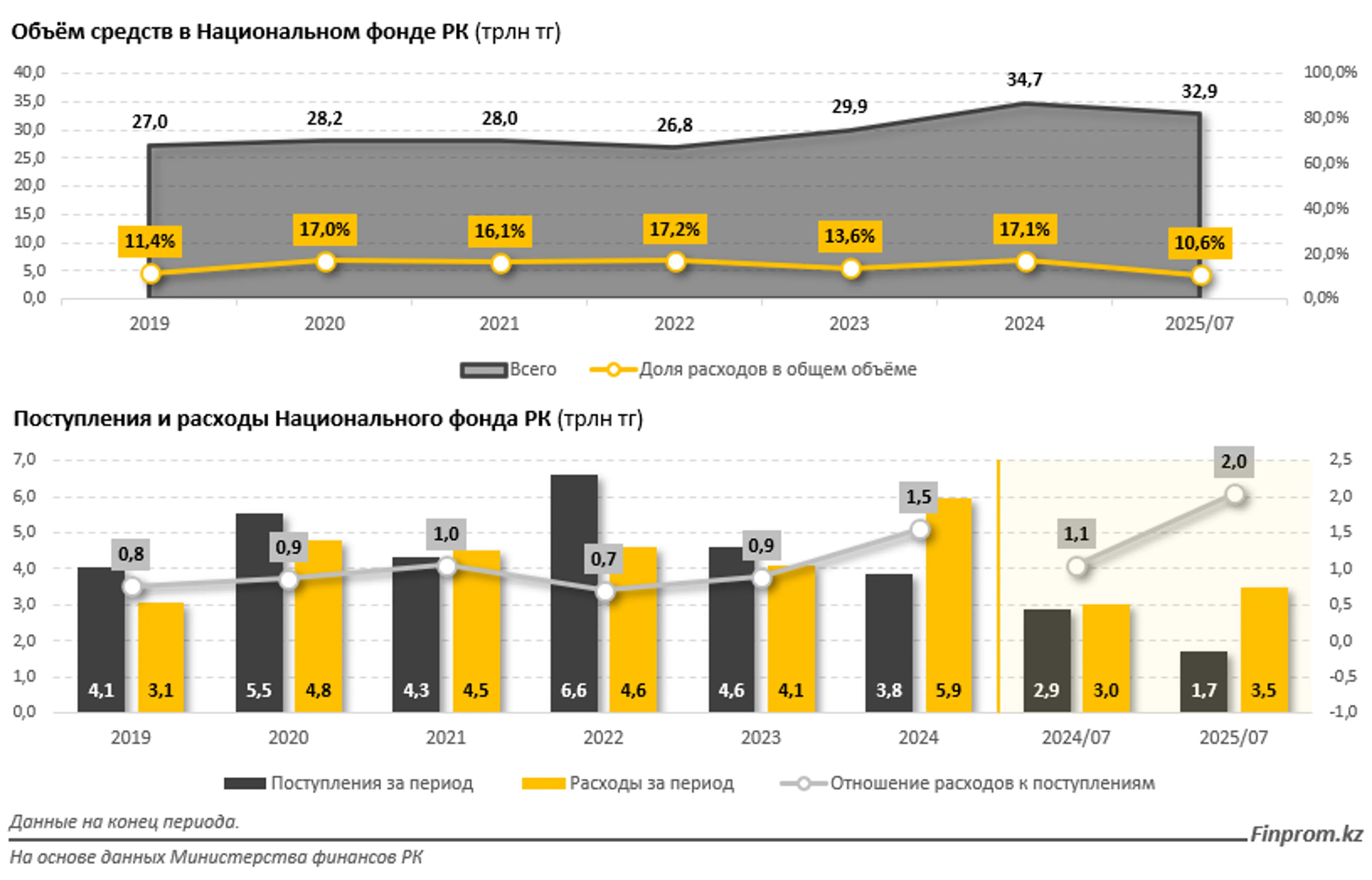 Многолетняя динамика объёмов средств в Нацфонде свидетельствует о том, что с 2019 по 2024 год они увеличились на 28,4%, достигнув 34,7 трлн тенге. Доля изъятия за прошлый год составила 17,1% от общего объёма активов.