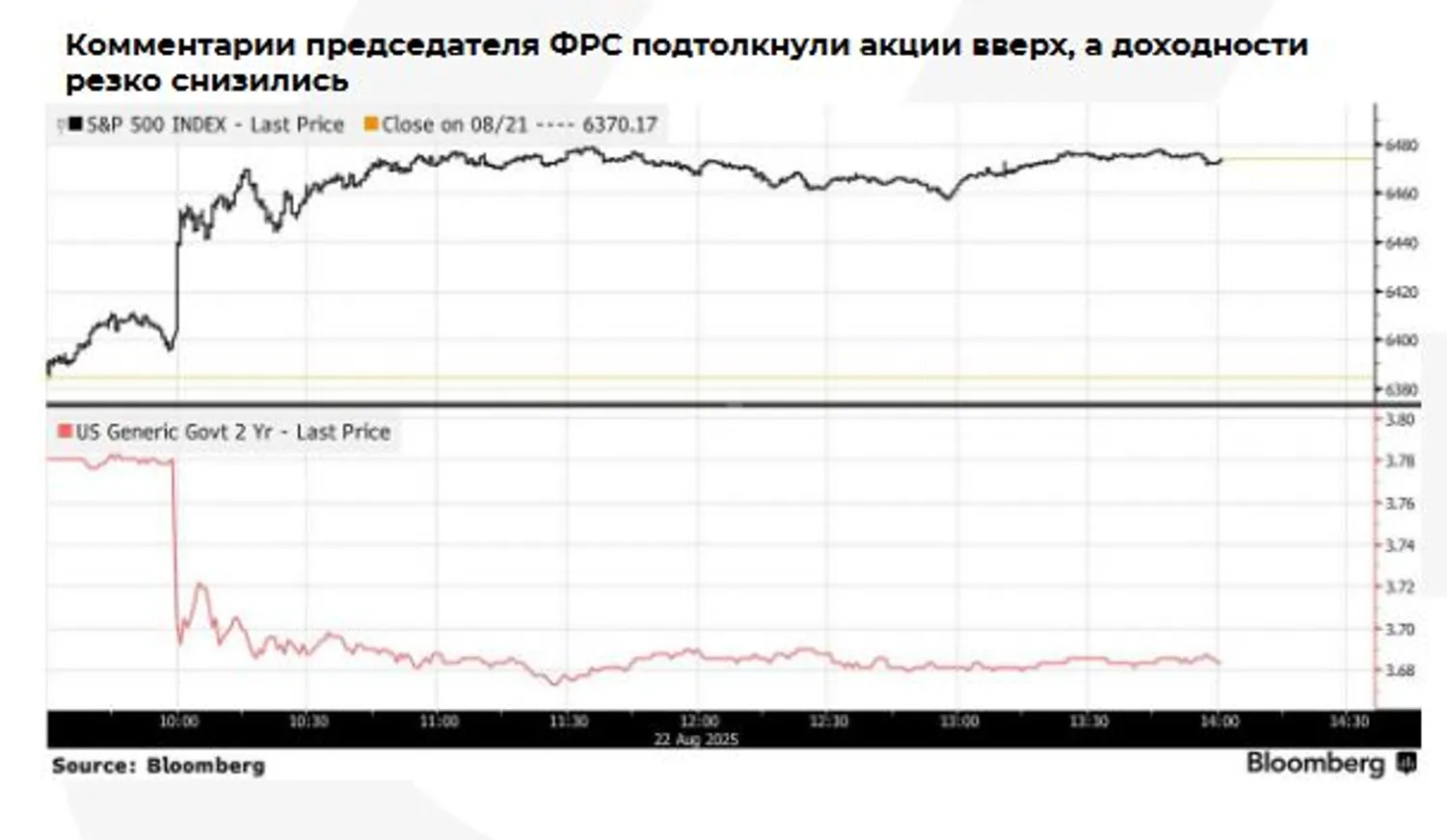 Кульминацией недели стало выступление Джерома Пауэлла на симпозиуме в Джексон-Хоуле. Глава ФРС отметил, что «баланс рисков смещается в сторону экономики и занятости», что рынок интерпретировал как сигнал к возможному снижению ставки уже в сентябре. Реакция была мгновенной: Dow Jones обновил исторический максимум, S&P 500 прибавил +1,6% за день, а Russell 2000 вырос почти на +4%. На долговом рынке доходности резко снизились: 10- летние Treasuries опустились к 4,26%, усилив спрос на акции высокодивидендных секторов: энергетику, недвижимость и коммунальные услуги. Золото подорожало до 3 418 долларов за унцию, нефть WTI закрепилась выше 64 долларов за баррель. Даже криптовалюты, включая биткоин (около 117 тыс. долларов) и эфириум (+14% за день), показали резкий отскок в моменте.