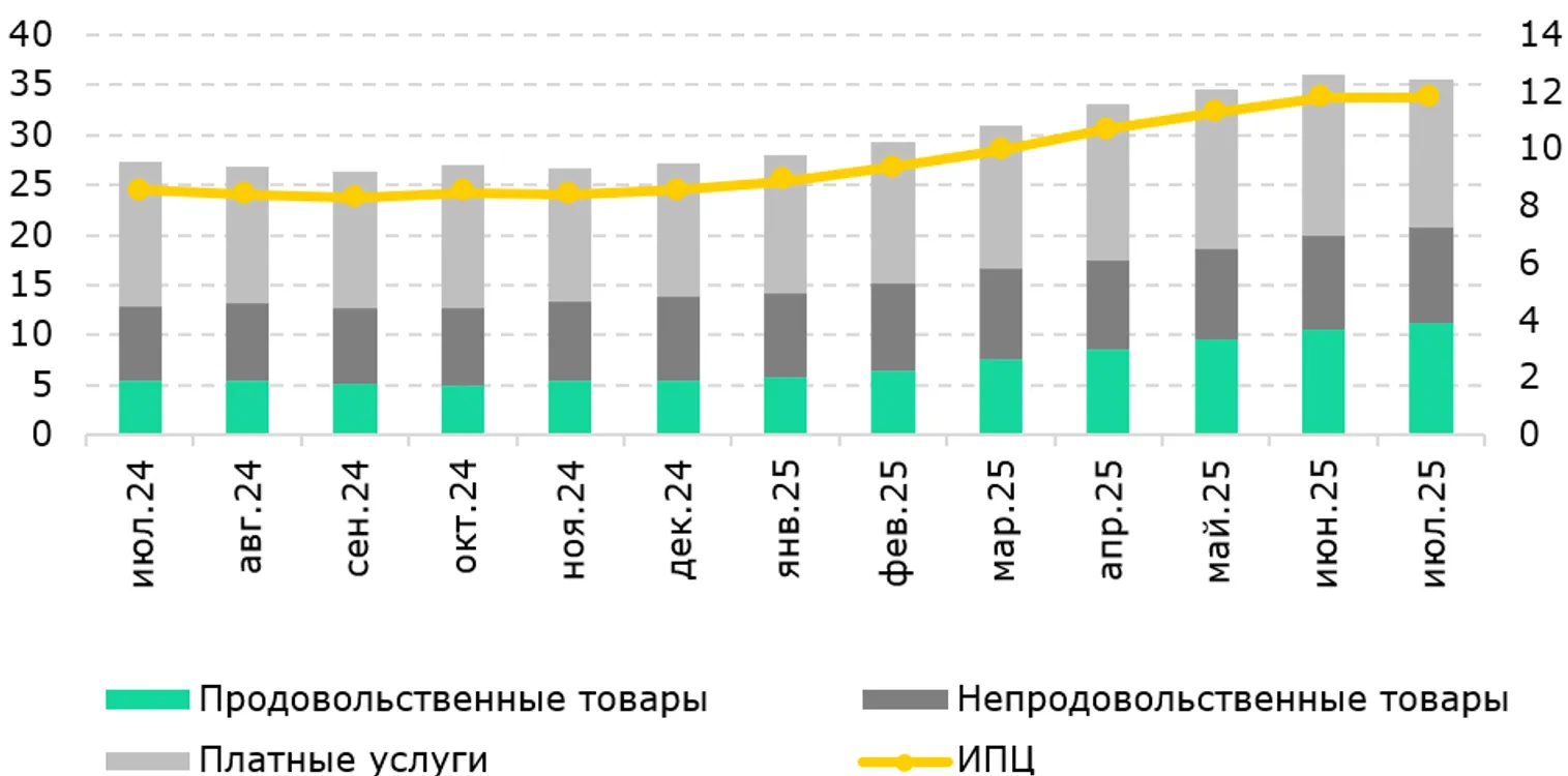 Наиболее заметное замедление в июле было зафиксировано в секторе платных услуг, где рост цен составил всего 0,5% м/м против 0,8% м/м в июне и пиковых значений в I квартале. Это было связано с замедлением темпов роста цен по услугам ЖКХ, что отразилось в снижении их вклада в годовую инфляцию до 1,77 п.п., по сравнению с 1,84 п.п. в июне и 1,87 п.п. в декабре 2024 года. Эта тенденция указывает на постепенное угасание эффекта от регулирования тарифов, имевшего место в начале года, особенно в период с февраля по апрель, когда были зафиксированы существенные повышения цен на электроэнергию, отопление и водоснабжение.