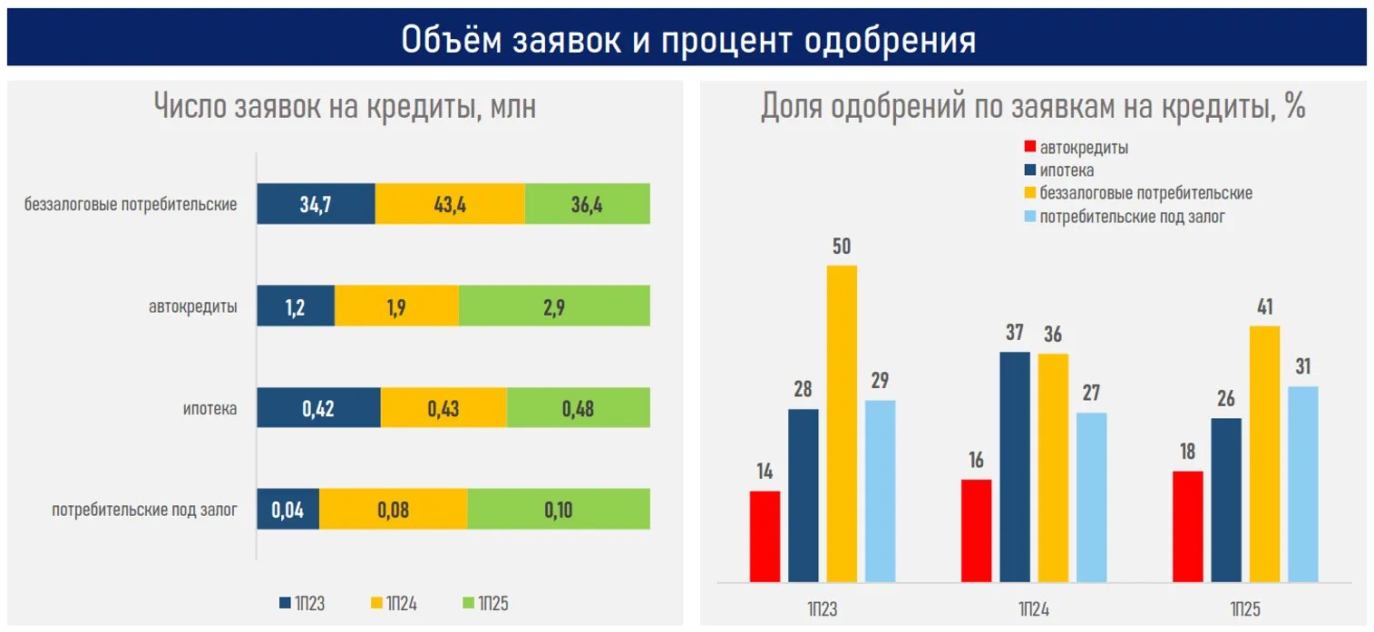 Качество спроса изменилось разнонаправленно. Банки активнее одобряли автокредиты, беззалоговые и залоговые займы, что отражает конкуренцию за надёжных заёмщиков, однако в ипотеке одобрения резко снизились (с 37% до 26%) из-за негативного влияния изменений ГЭСВ. При этом рост в сегментах с высоким средним чеком обеспечил более мягкое замедление всего портфеля (–0,8 п.п. против –16 п.п. по выдачам), что указывает на переход к более «качественному» росту.