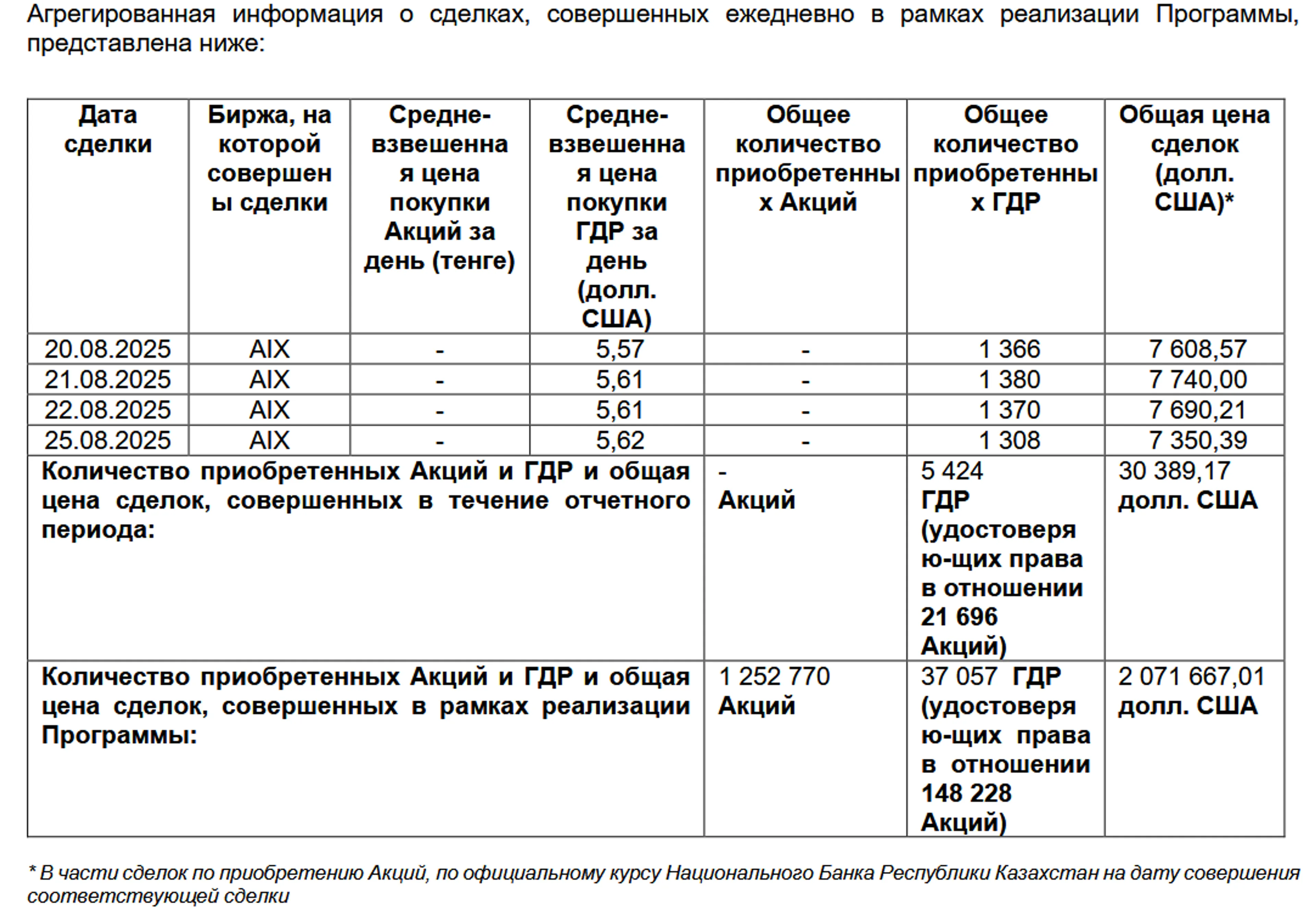 В рамках второго этапа программы обратного выкупа простых акций и глобальных депозитарных расписок (ГДР) Air Astana дополнительно выкупила на AIX с 20 по 25 августа 2025 года 5 424 ГДР, сообщает корреспондент центра деловой информации Kapital.kz со ссылкой на информацию авиаперевозчика на сайте KASE.