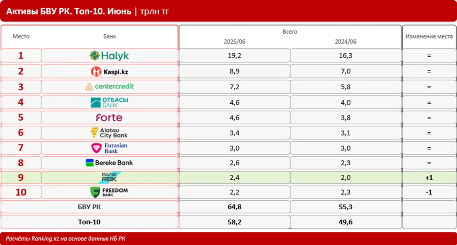 Активы казахстанских банков по итогам первого полугодия 2025 года достигли 64,8 трлн тенге — на 17,2% больше, чем годом ранее, сообщает Ranking.kz со ссылкой на данные НБ РК. В том числе почти 90% суммарно пришлось на десятку топовых БВУ: 58,2 трлн тенге, плюс 17,4% за год.