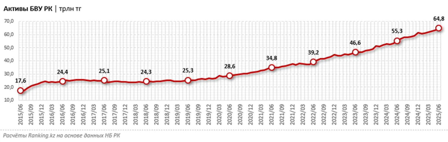 Для справки: совокупный объем активов БВУ РК за пять лет вырос в 2,3 раза, а за десятилетие — сразу в 3,7 раза. Рентабельность банковских активов ROA на 1 июля 2025 года составила 4,6% (а рентабельность капитала ROE — 31,7%, в то время как чистая прибыль за полугодие — 1,4 трлн тенге, плюс 19,2% за год).