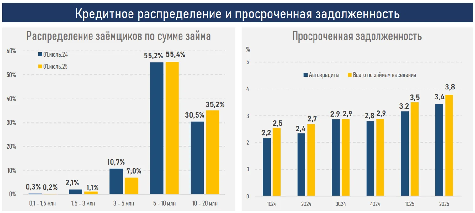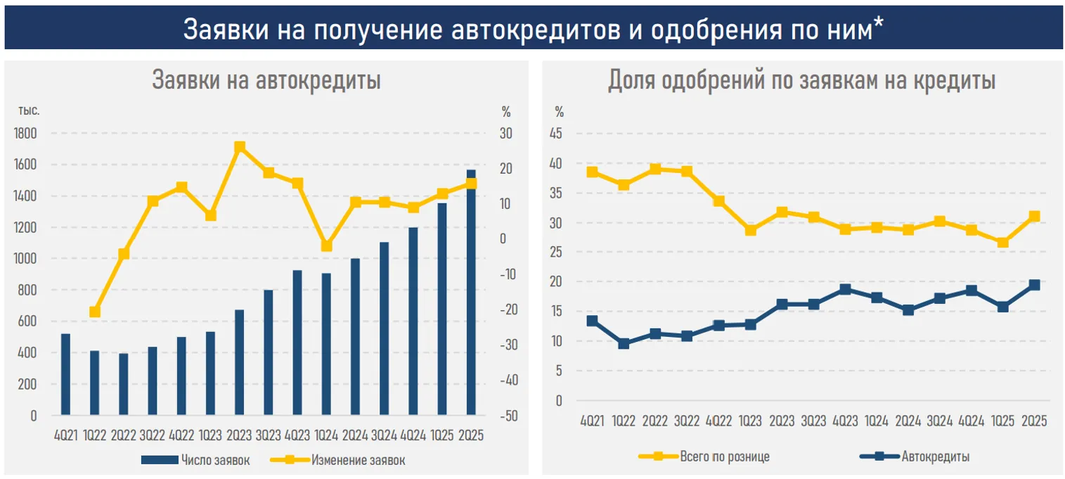 - Количество заявок на автокредит за 6М25 выросло на 54% г/г и достигло 2,9 млн. Одновременно доля автомобилей, купленных в кредит, поднялась с 36% до 59%. Общее количество зарегистрированных автомобилей выросло на 3%. Фактически автокредит трансформировался из нишевого инструмента в массовый продукт, используемый большинством покупателей авто в стране.