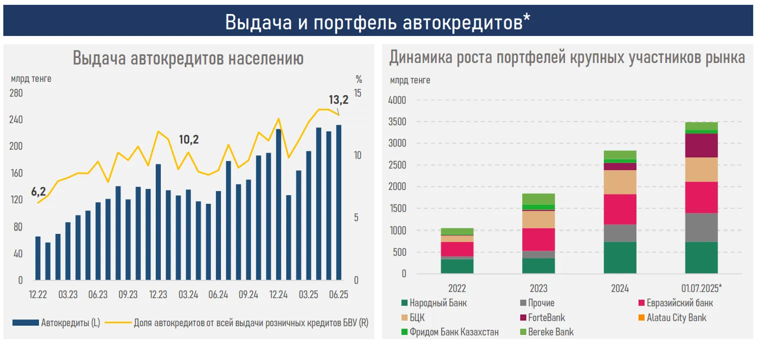 - За этот период банки выдали автокредиты на 1,2 трлн тенге (+53% г/г), и их доля в новых займах населению выросла с 8,8% до 13,2%, что сделало автокредитование одним из ключевых драйверов роста розничного рынка.