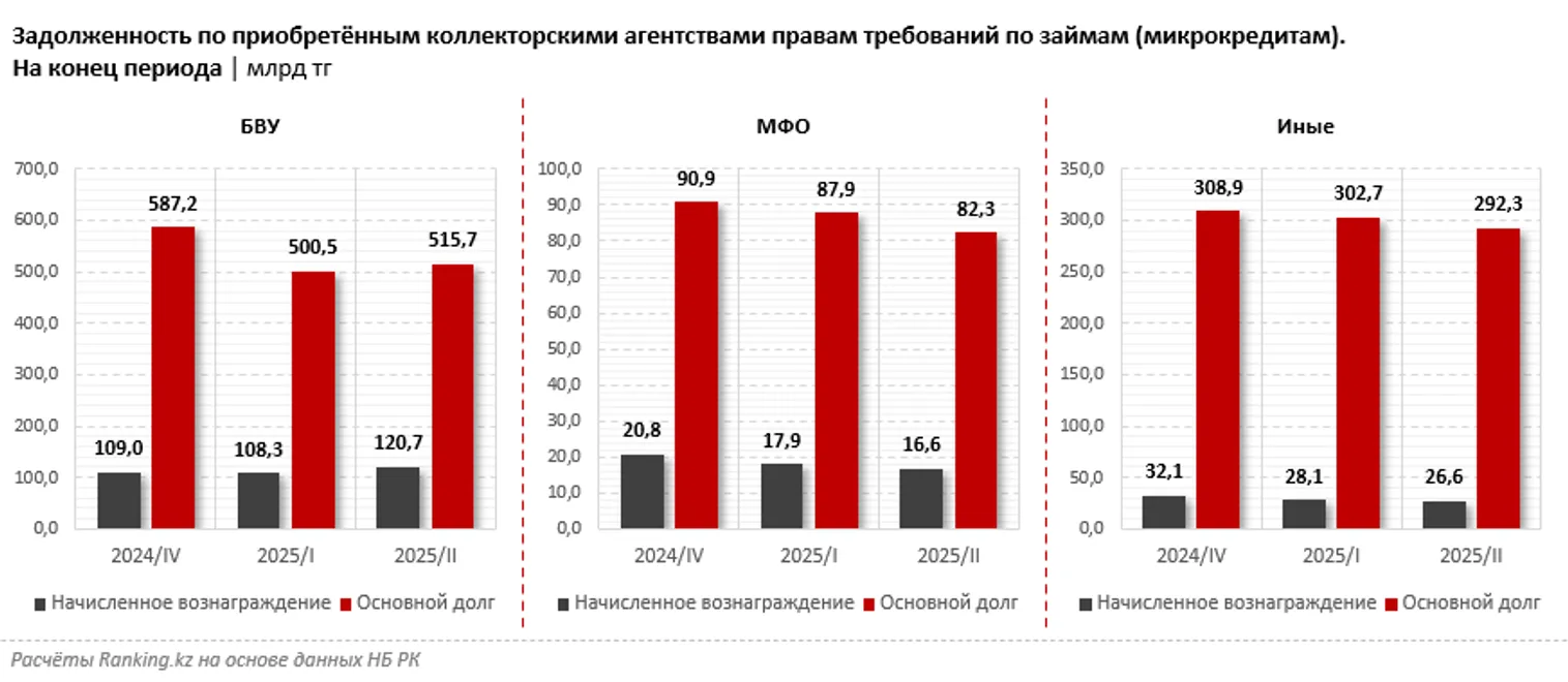 По приобретённым коллекторскими агентствами правам требований по займам БВУ на начисленное вознаграждение пришлось сразу 19%, или 120,7 млрд тенге — на 11,4% больше, чем в первом квартале. Основной долг за квартал вырос лишь на 3%, составив 515,7 млрд тенге.