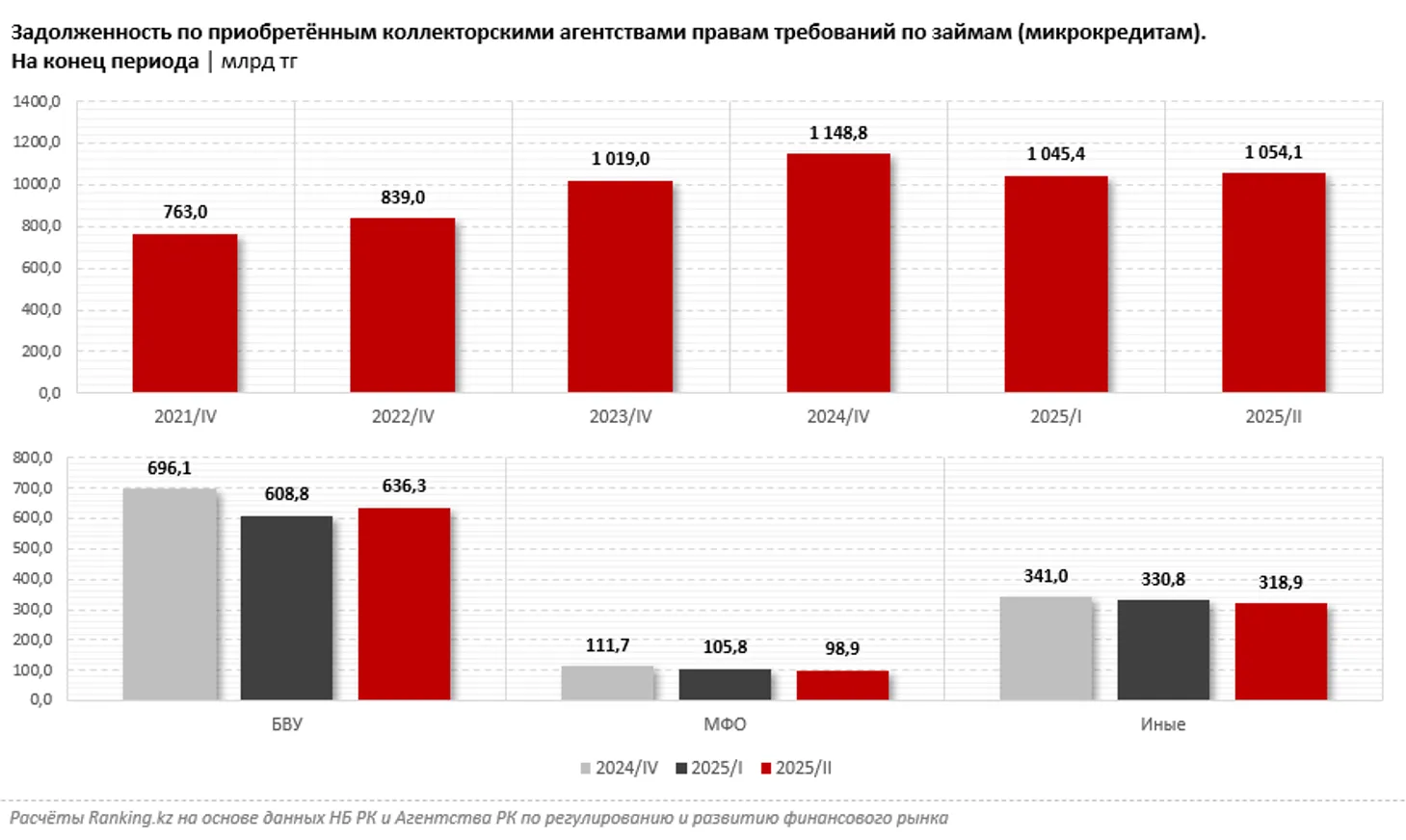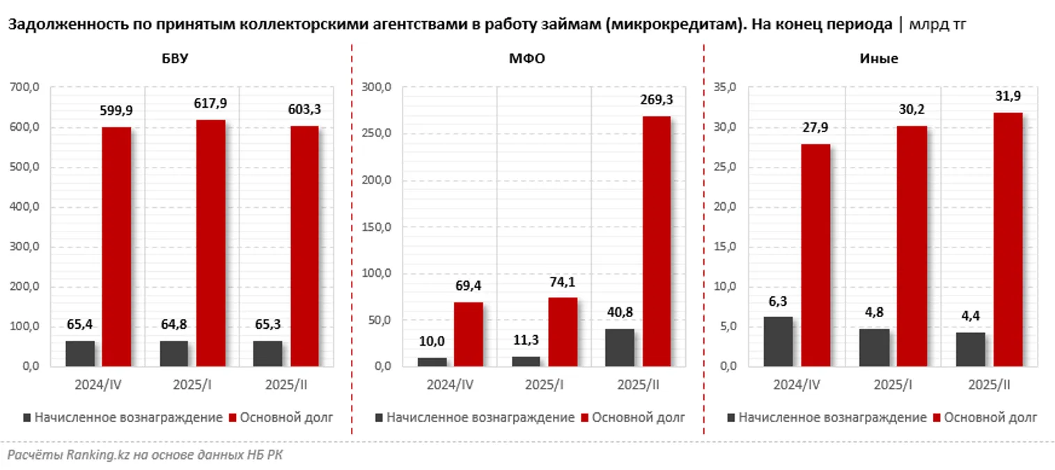 Совокупный объём задолженности по приобретённым коллекторскими агентствами правам требований по займам на конец июня 2025 года составил 1,1 трлн тенге — на 0,8% больше, чем в предыдущем квартале. Из них на основной долг пришлись 890,2 млрд тенге (лишь на 0,1% меньше, чем кварталом ранее), а на начисленное вознаграждение — 163,9 млрд тенге (на 6,2% больше).