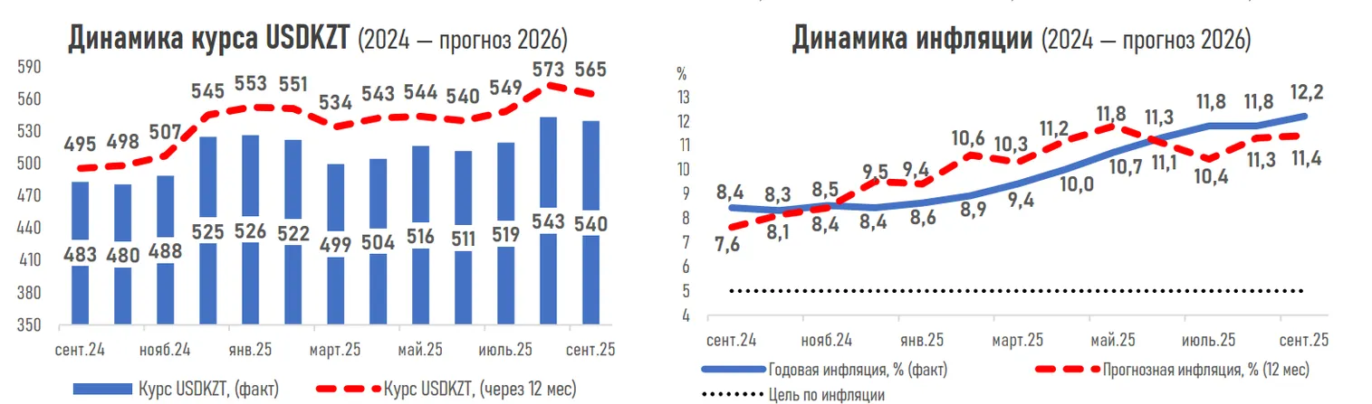 К началу октября курс USD/KZT ожидается вблизи 541,6 тенге за доллар, а годовой горизонт предполагает ослабление до 565,0 тенге за доллар (в предыдущем прогнозе – 541,7 и 573,0 соответственно). Обновленные уровни отражают смещение ожиданий в пользу более умеренного ослабления на горизонте 12 месяцев.