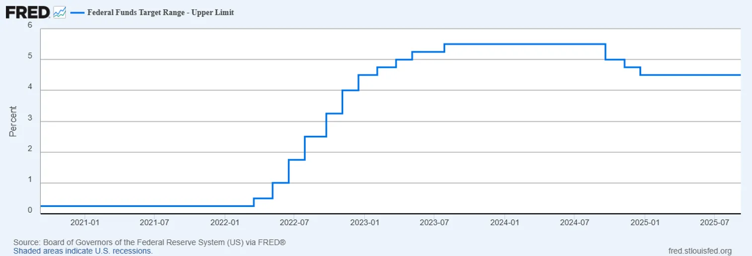 График 1. Ключевая ставка ФРС, 2022–2025 гг. Источник: данные ФРС (FRED)