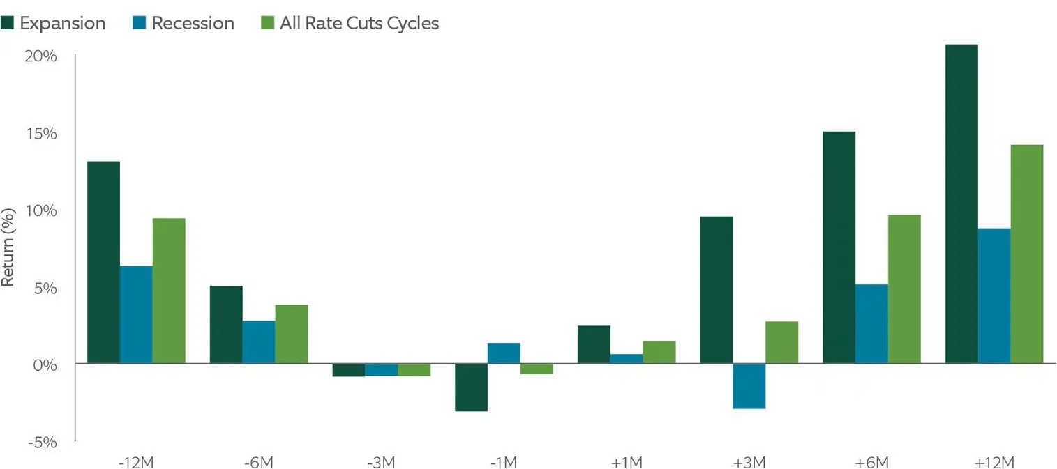 График 2. Доходности индекса S&P 500 за месяцы до и после первого снижения ставки ФРС (1980–2024 гг.)