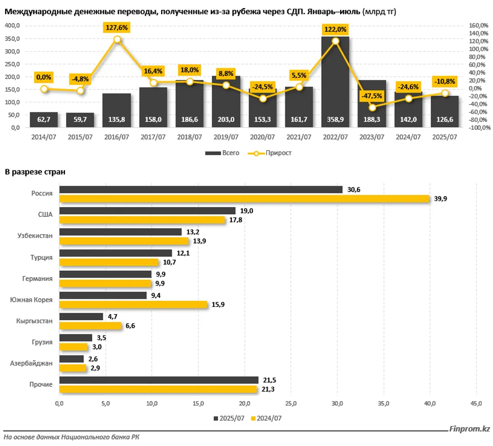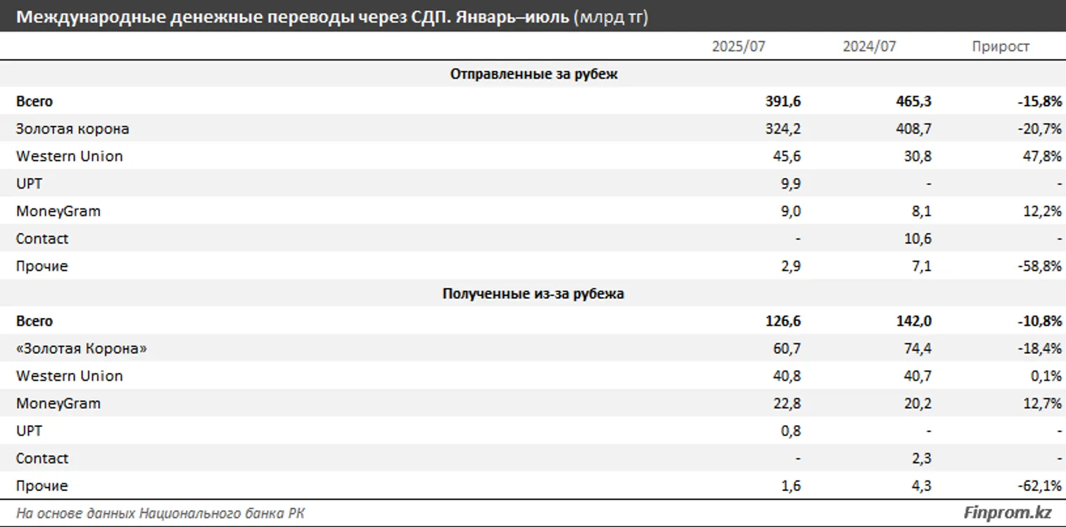 СДП MoneyGram укрепила позиции, увеличив объём полученных переводов на 12,7%, до 22,8 млрд тенге. Через UPT в Казахстан поступило лишь 758,8 млн тенге. На прочие системы пришлось 1,6 млрд тенге — в 2,6 раза меньше, чем за январь–июль 2024 года.