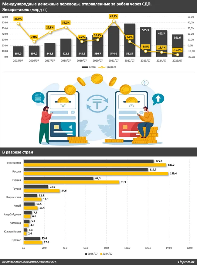 За январь–июль 2025 года объем международных денежных переводов, отправленных из Казахстана через системы денежных переводов (СДП), составил 391,6 млрд тенге — на 15,8% меньше, чем за аналогичный период прошлого года. Это минимальный показатель за последние пять лет, и сокращение фиксируется третий год подряд, сообщает finprom.kz.