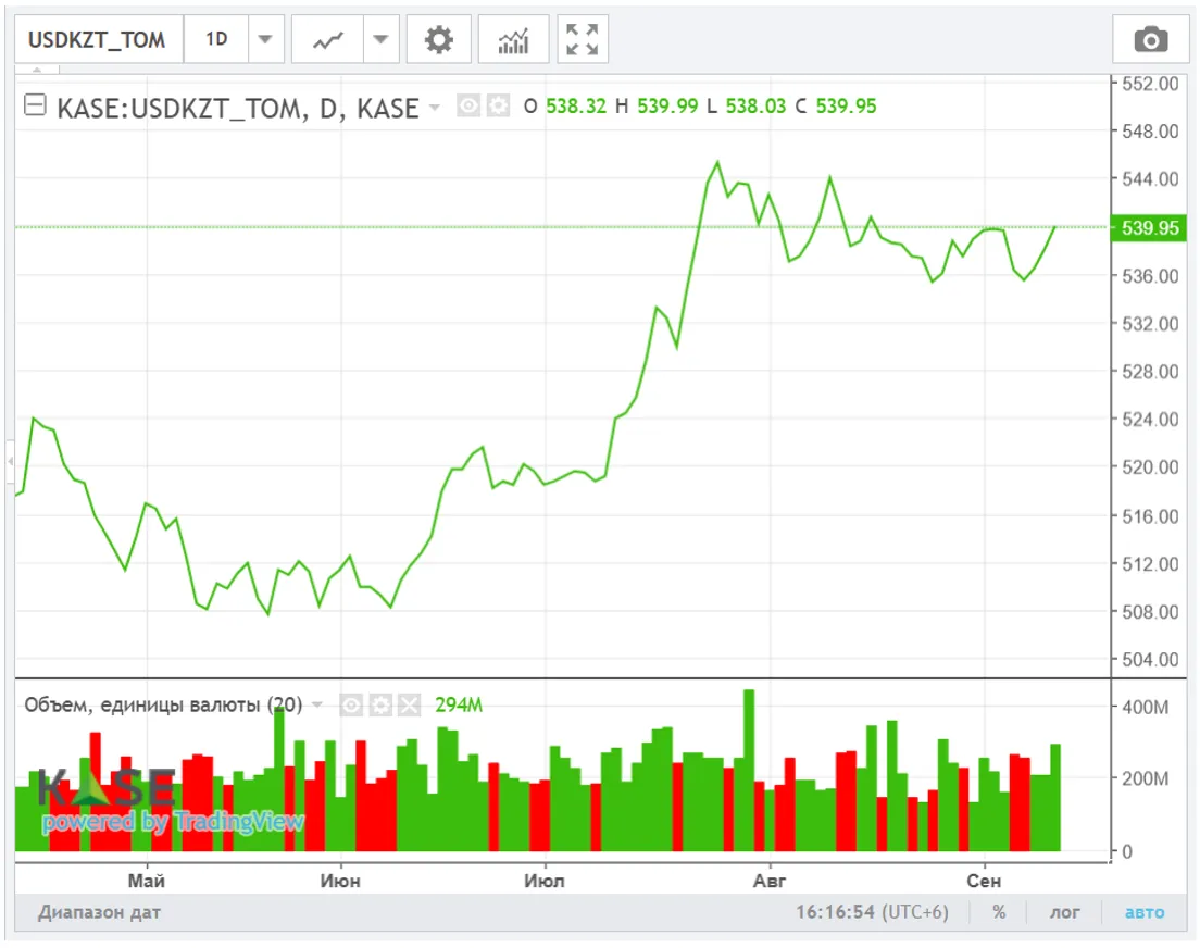 Нацвалюта продолжает слабеть четвёртую сессию подряд. Так, курс по паре USD/KZT вырос до 539,08 тенге за доллар (+0,84 тенге). При этом активность участников валютного рынка заметно увеличилась – объём торгов составил 294,2 млн долларов против 212,1 млн долларов днём ранее. Подобная динамика могла объясняться совокупностью факторов: ситуацией на локальном валютном рынке и неблагоприятным внешним фоном (снижение нефтяных котировок наряду с ростом индекса доллара США во время валютных торгов). Возможно, участники локального рынка воспользовались текущим курсом для приобретения инвалюты в рамках оплаты импортных контрактов, а также для погашения и обслуживания внешних обязательств.
