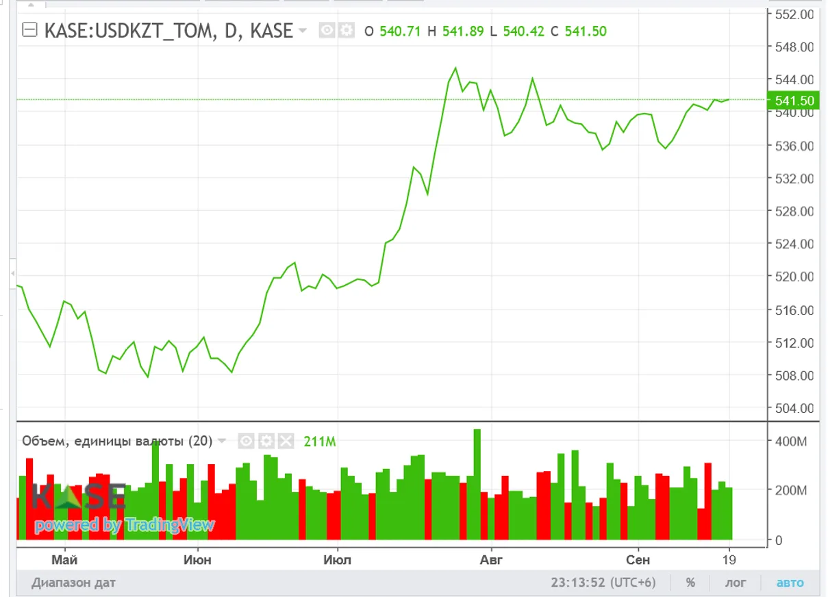 Средневзвешенный курс доллара на Казахстанской фондовой бирже (KASE) 19 сентября на 17:00 составил 541,34 тенге. По сравнению с данными на 17:00 18 сентября (541,28 тенге за 1 доллар) нацвалюта к доллару ослабла на 0,06 тенге, сообщает корреспондент центра деловой информации Kapital.kz.