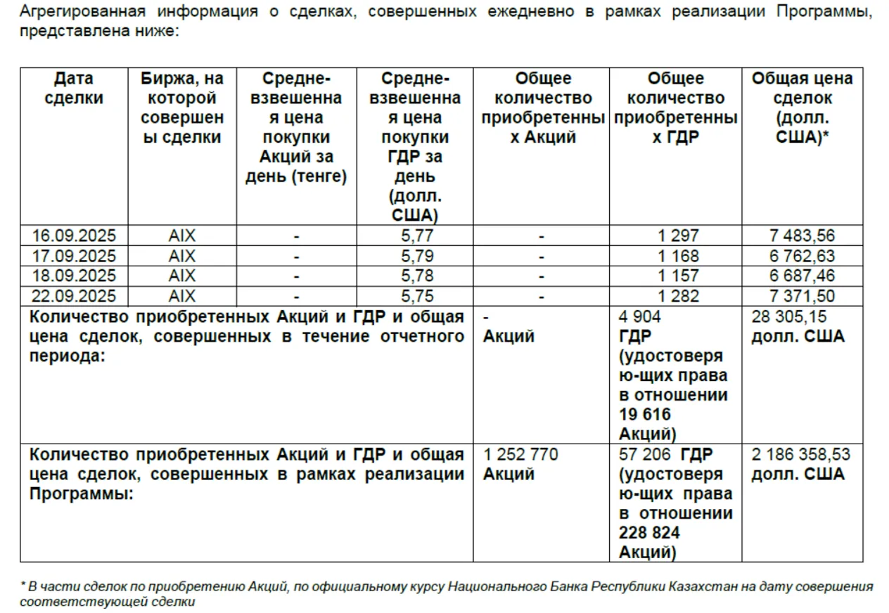 В рамках второго этапа программы обратного выкупа простых акций и глобальных депозитарных расписок (ГДР) Air Astana дополнительно выкупила на AIX с 16 по 22 сентября 2025 года 4 904 ГДР, сообщает корреспондент центра деловой информации Kapital.kz со ссылкой на информацию авиаперевозчика на сайте KASE.
