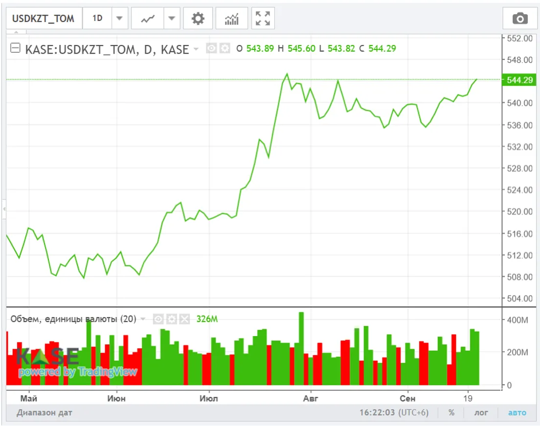 Спрос на инвалюту во вторник превышал её предложение, что обусловило дальнейший рост курса USD/KZT. По итогам торгов средневзвешенный курс по паре USD/KZT вырос до отметки 544,91 тенге за доллар (+1,98 тенге) при объеме торгов в 326,1 млн долларов (-14,3 млн долларов). Крупные покупки инвалюты могли происходить как ввиду уже существующих внутренних факторов (оплата импорта, обслуживание внешних обязательств, пересмотр ожиданий по курсу и т.д.), так и в ответ на приближение завершения сентября и третьего квартала, когда традиционно растёт волатильность на рынке из-за необходимости осуществления разовых валютных операций субъектами экономики.
