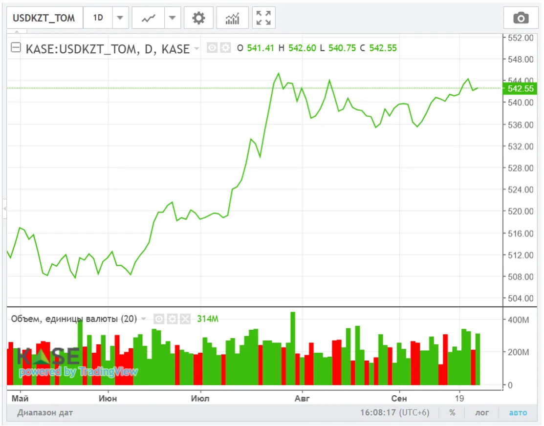 На дневной торговой сессии четверга продавцы инвалюты имели перевес над её покупателями. По итогам дня средневзвешенный курс по паре USD/KZT снизился до 541,81 тенге за доллар (-0,79 тенге) при повышенном объеме торгов в 314,3 млн долларов (+100,6 млн долларов). Увеличение предложения инвалюты на локальном рынке могло происходить как под влиянием сезонных причин (тенговые выплаты перед завершением квартала, включая налоги, заработную плату и прочие операционные расходы), так и фундаментальных факторов, среди которых – высокие процентные ставки в экономике и операции по продаже инвалюты НБРК.
