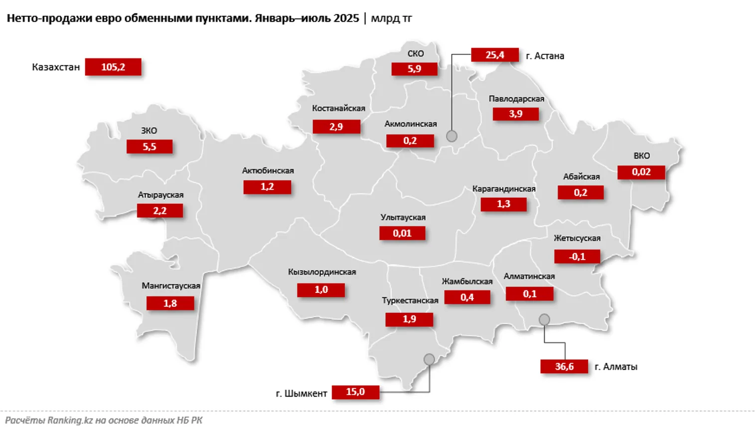 В региональном разрезе положительные объёмы нетто-продаж евро обменными пунктами наблюдались в 19 из 20 регионов РК. Наибольшие объёмы пришлись на мегаполисы — Алматы (36,6 млрд тенге), Астану (25,4 млрд тенге) и Шымкент (15 млрд тенге). В остальных регионах объём нетто-продаж варьировался от 8,3 млн тенге в Улытауской до 5,9 млрд тенге в Северо-Казахстанской области. Единственный регион, в котором в обменные пункты сдали больше евро, чем приобрели — Жетысуская область, где объём нетто-продаж составил минус 147,7 млн тенге.