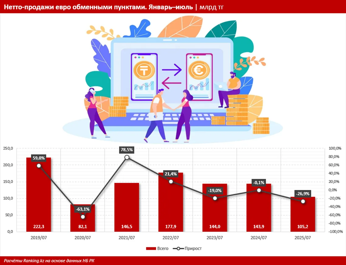 Если же рассматривать данные за период, видно, что в целом за январь–июль 2025 года объём нетто-продаж составил 105,2 млрд тенге — на ощутимые 26,9% меньше, чем за соответствующий период 2024-го. Годом ранее в аналогичном периоде объём нетто-продаж евро показывал незначительное сокращение: лишь на 0,1%.