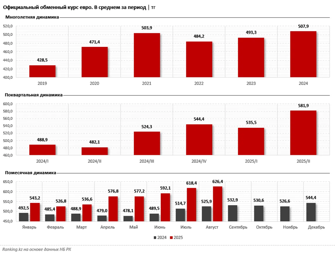 Официальный обменный курс евро в среднем за 2024 год составил 507,9 тенге, что стало самым высоким годовым показателем. За год курс вырос на 2,9%. При этом в первом квартале 2024-го он составлял 488,9 тенге, во втором — и того меньше: 482,1 тенге. Однако уже в третьем квартале курс евро подскочил до 524,3 тенге, а в четвёртом — до 544,4 тенге. 2025 год европейская валюта начала с ослабления: за первый квартал евро подешевел, но лишь на 1,6%, до 535,5 тенге. Уже во втором квартале средний курс вырос до 581,9 тенге — на 8,7% больше, чем в предыдущем квартале, и сразу на 20,7% выше по сравнению со вторым кварталом 2024-го.