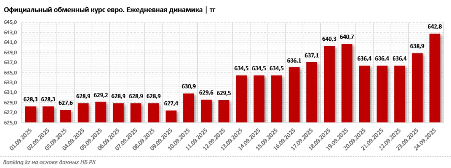 В третьем квартале текущего года средний курс евро за месяц превысил 600 тенге: в июле он составил 618,4 тенге, а в августе — уже 626,4 тенге, что на 19,1% выше, чем в августе 2024-го. Первый осенний месяц евро начал на отметке 628,3 тенге, а к 24 сентября подскочил на 2,3%, до 642,8 тенге. С начала года курс вырос на 17,6%.