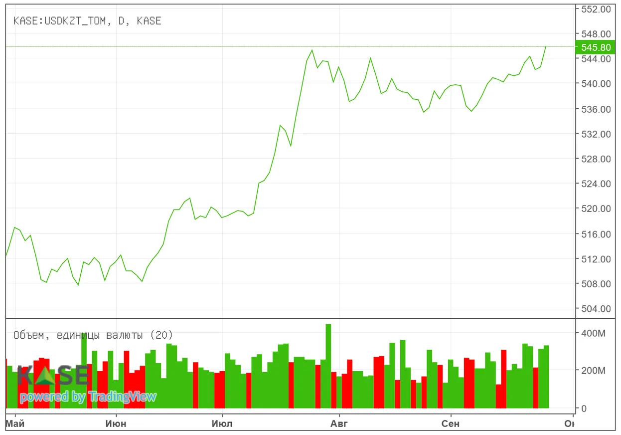 По итогам биржевых торгов пятницы курс USD/KZT вырос до 544,45 тенге за доллар (+2,64 тенге). При этом торговая активность на рынке удерживается на высоком уровне: совокупный объём торгов составил 334,4 млн долларов против 314,3 млн долларов днём ранее. Покупки инвалюты могли происходить за счет таких внутренних факторов, как оплата импорта, обслуживание внешних обязательств, ухудшение инфляционных и курсовых ожиданий. Дополнительное давление мог оказать пересмотр Министерством экономического развития РФ прогнозного курса USD/RUB в сторону повышения, до 92,6 рубля за доллар.