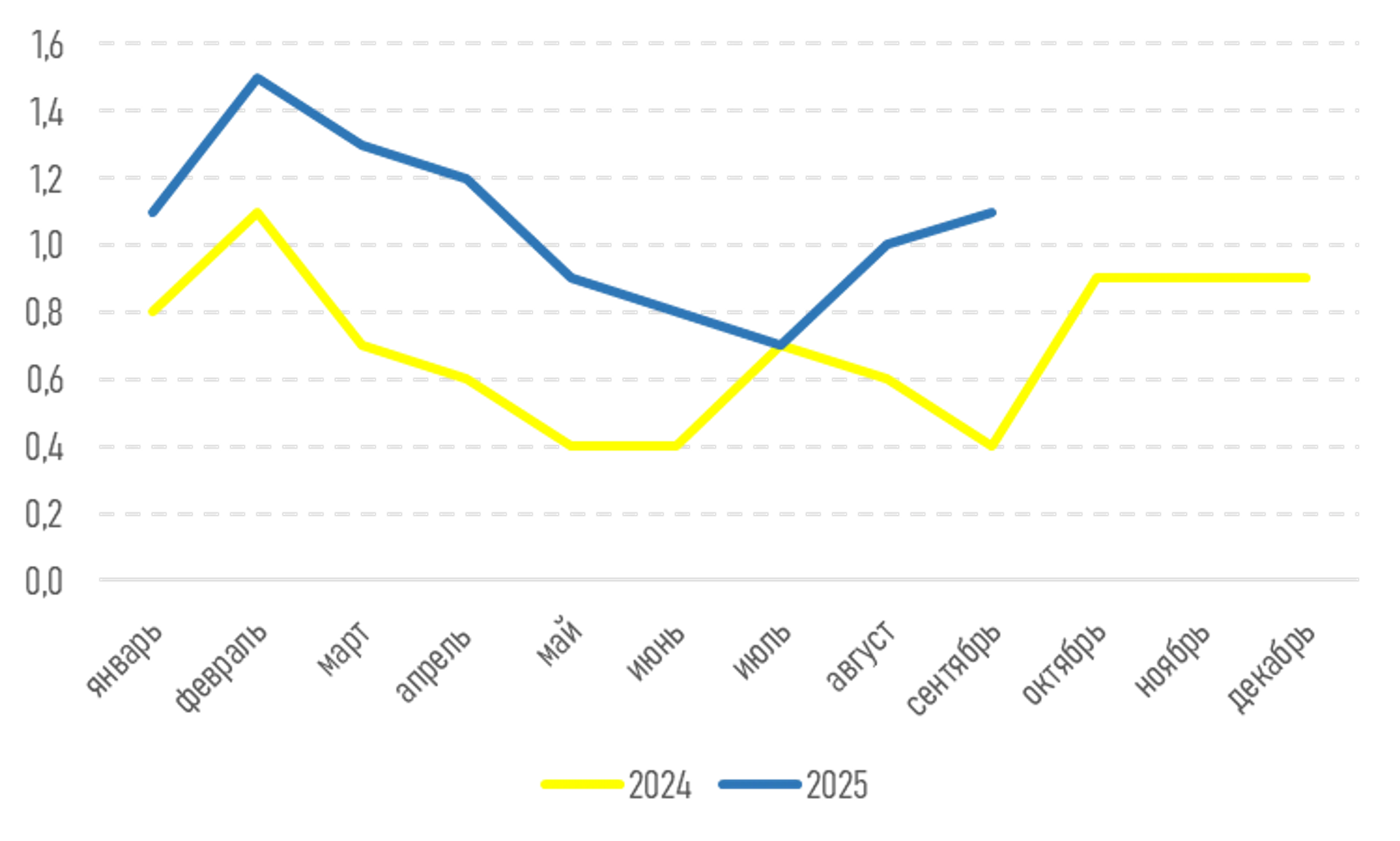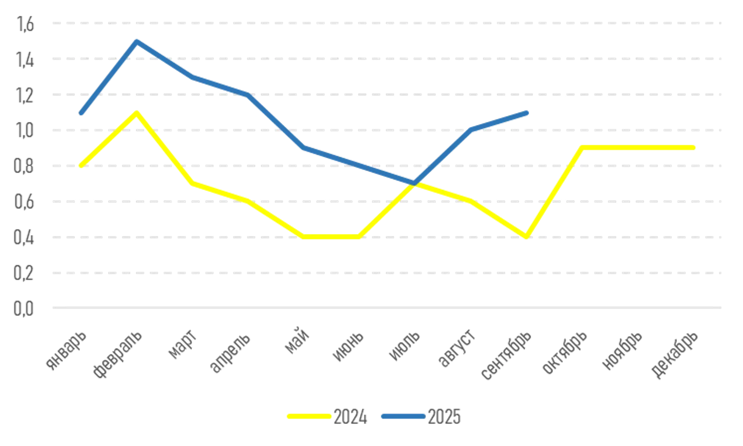 Месячный показатель ИПЦ ускорился до 1,1%, а годовой составил 12,9%